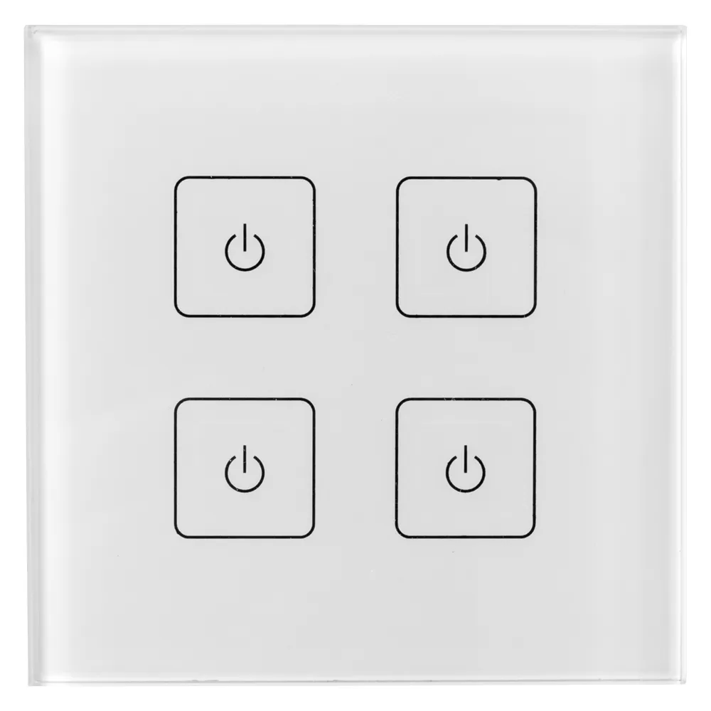 Встраиваемая сенсорная панель с выходом DALI. 4 кнопки, 4 адреса. Каждой кнопкой выполняется включение, выключение и диммирование по соответствующему ей адресу. Установка стартового адреса управления выполняется переключателями на корпусе. Питание от шины DALI (4 мА).