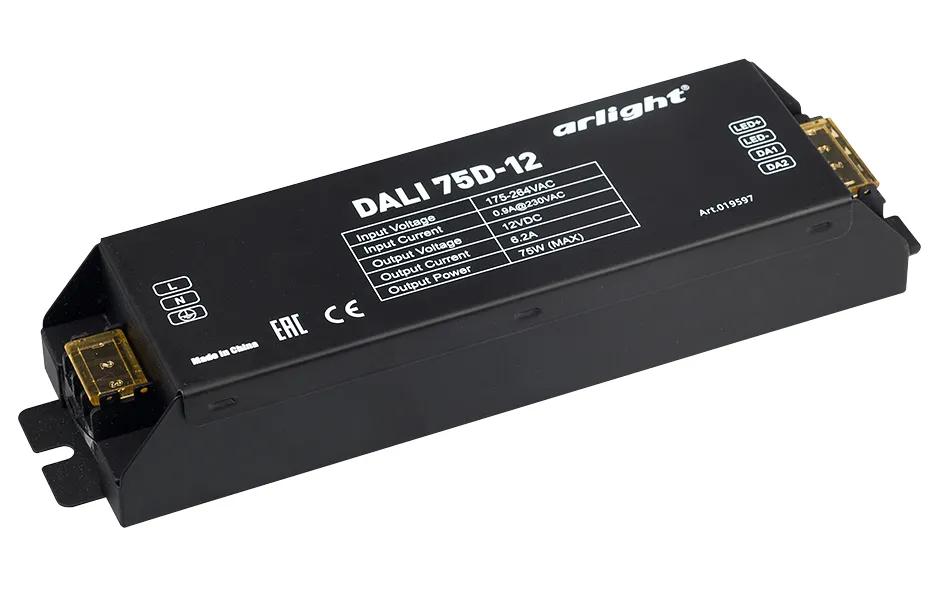 DALI диммер на 1 адрес, совмещенный с блоком пит-я, для одноцветных с/д лент, 1 канал. Функция PUSH DIMMER, работает с DALI Touch switch. "Умный дом". Пит-е AC175-264V; Выход 12VDC; Макс.ток 1х6.2A; Макс. мощность 75W; Размеры 204х54х33 мм; Вес 440г. Заменяется на 024344