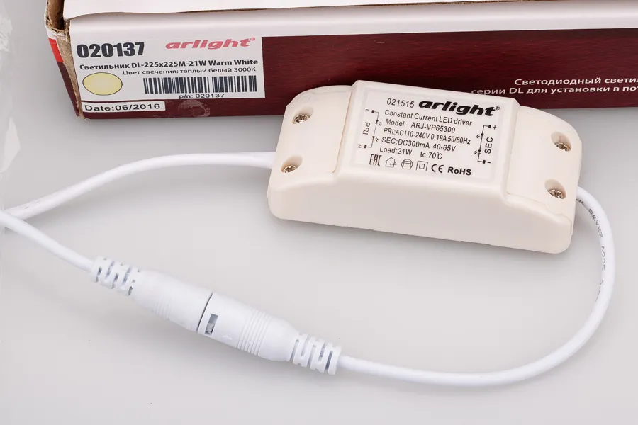 Тонкая панель 21Вт, белый квадратный корпус. Цвет ТЕПЛЫЙ БЕЛЫЙ 3000K, св.поток 1575-1680лм, CRI(Ra)>80, угол 120°. Размер 225x225мм, высота корпуса 13мм, установка в отверстие 210x210мм. Питание AC 180-240V, 21Вт, драйвер в комплекте (DC300mA, 55-65V).
