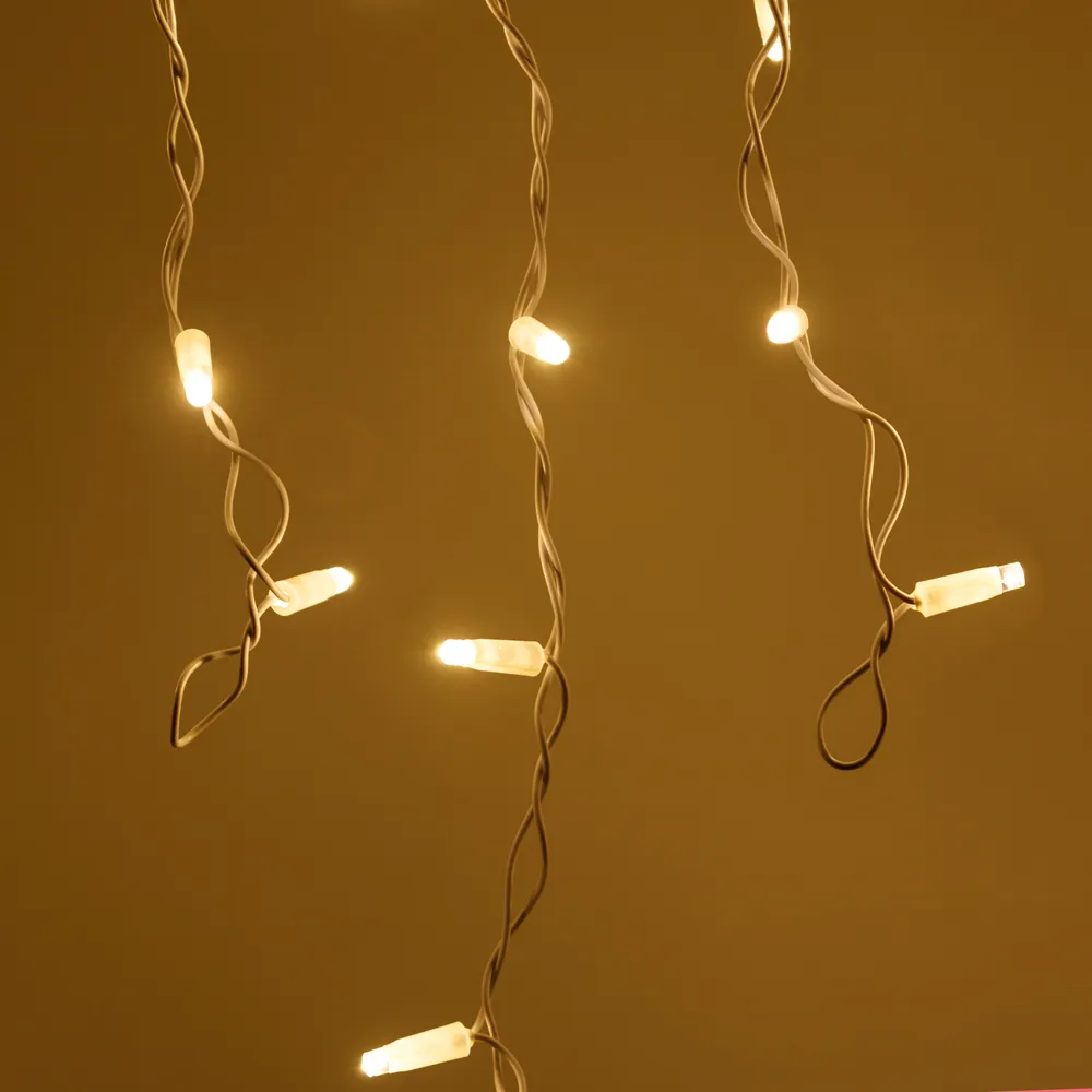 Светодиодная бахрома Classic. Размер 2400x600 мм (длина 2400 мм, по длине 24 нити высотой 200/600 мм). Количество светодиодов 88 шт размером 7 мм. Цвет свечения ТЕПЛЫЙ БЕЛЫЙ (3000 К), эффект постоянного свечения с резким световым рисунком (прозрачная вогнутая линза). Провод белый, ПВХ. Питание 230 В, Мощность 6 Вт, защита IP65, применение на улице под навесом. Аксессуары для подключения приобретаются отдельно.