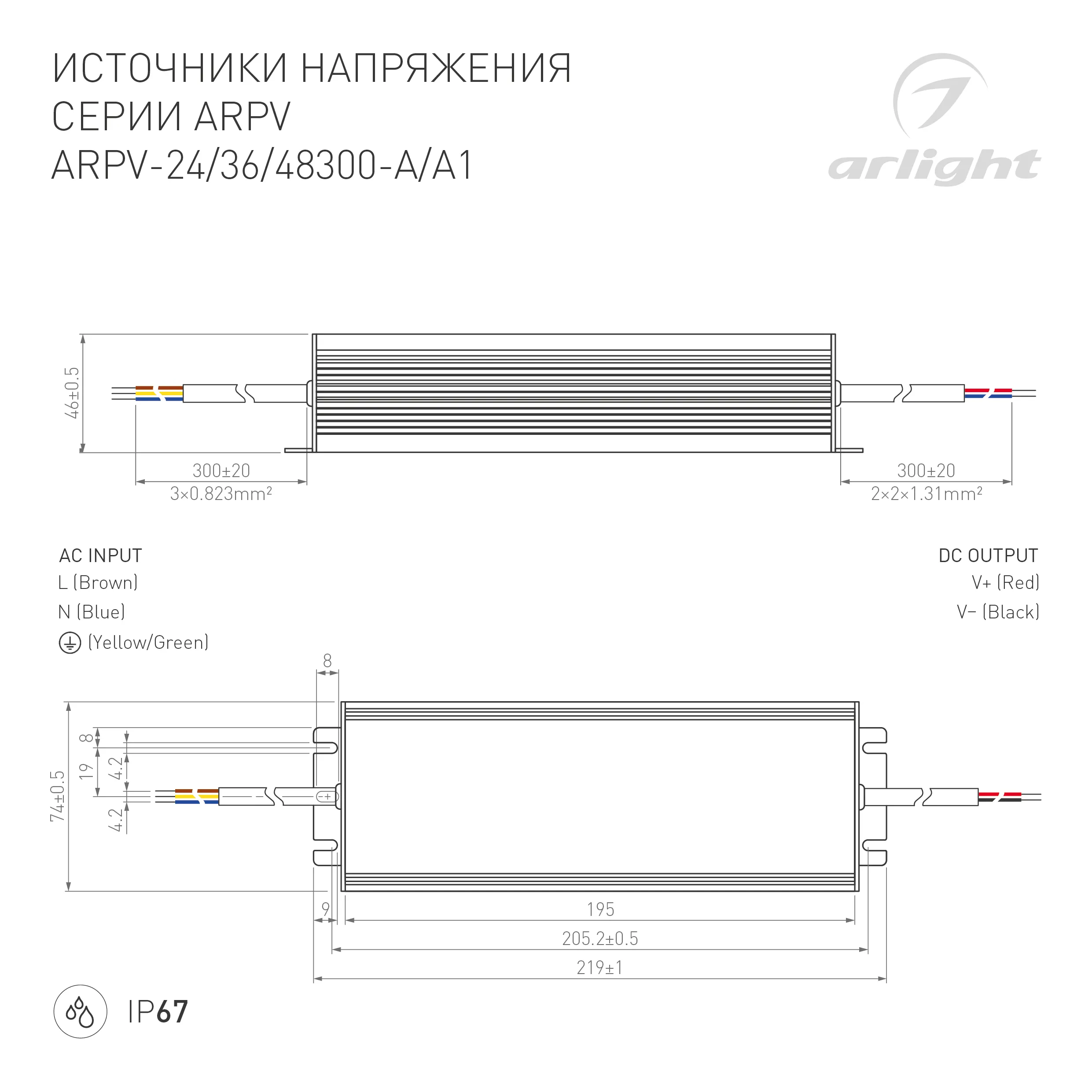 Источник напряжения с гальванической развязкой для светодиодных изделий. Входное напряжение 176-264 VAC. Выходные параметры: 36 В, 8.3 А, 300 Вт. Встроенный PFC >0.5. Герметичный алюминиевый корпус IP 67. Рабочая температура -40…+70C⁰. Габаритные размеры длина 219 мм, ширина 74 мм, высота 46 мм. Гарантийный срок 3 года.