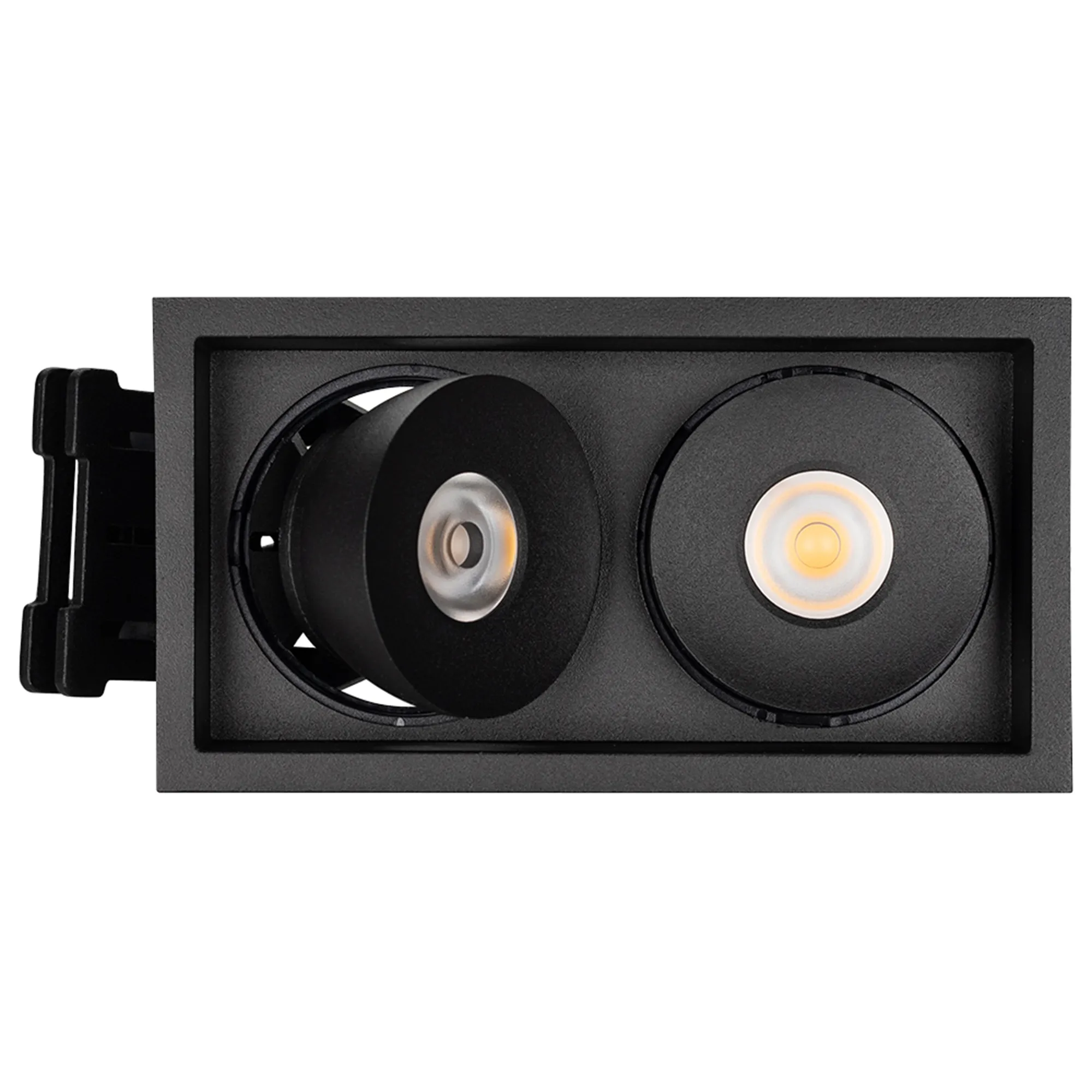 Встраиваемый поворотный светильник для потолка. Мощность 2x9W, цвет ДНЕВНОЙ 4000K, св.поток 1260лм, угол 45°, RA>90. Корпус прямоугольный черный. Питание AC180-240V. Размеры LxWxH 148x80x90мм. Установка в отверстие 140x70мм. Драйвер в комплекте 2 шт (30-45V, 220mA).