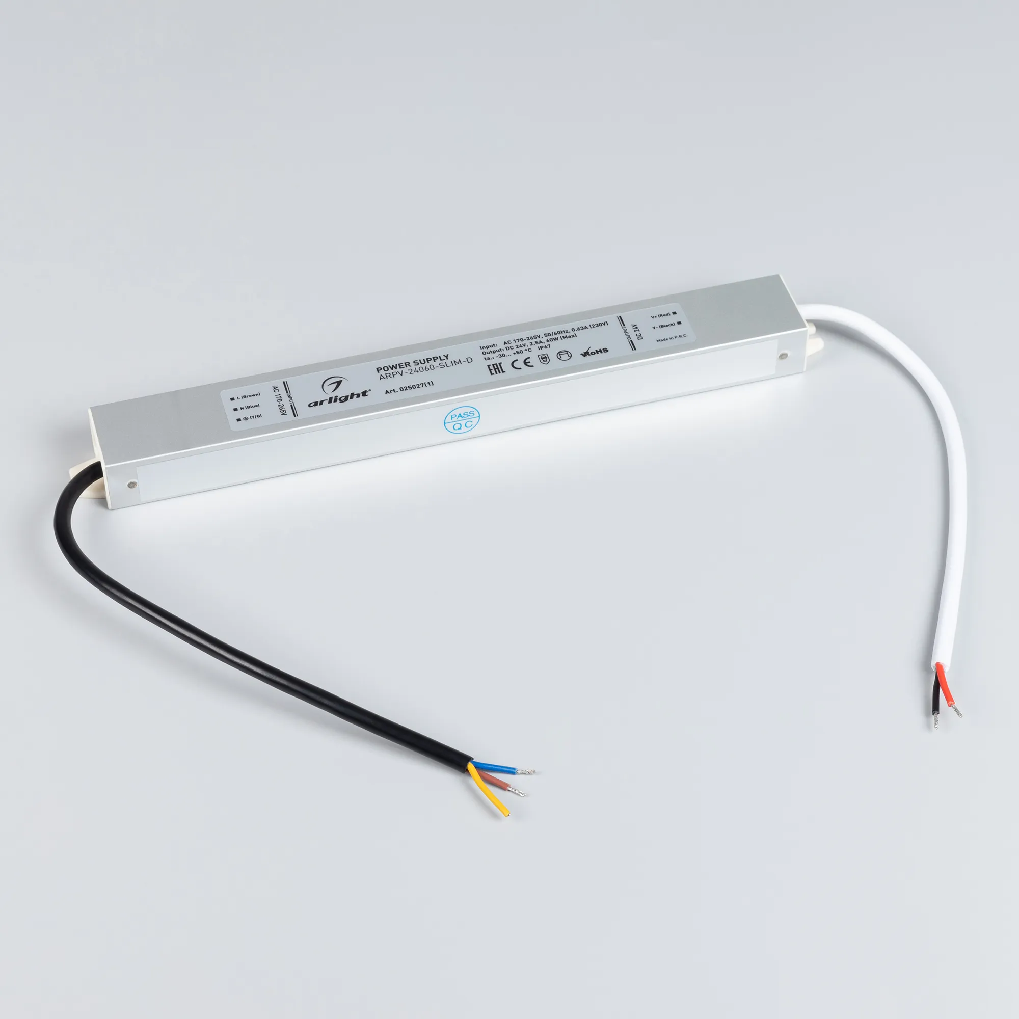 Источник напряжения с гальванической развязкой для светодиодных изделий. Входное напряжение 170-265 VAC. Выходные параметры: 24 В, 2,5 А, 60 Вт. Встроенный PFC >0,5. Герметичный алюминиевый корпус IP 67. Рабочая температура -30…+50C⁰. Габаритные размеры длина 257 мм, ширина 30 мм, высота 20 мм. Гарантийный срок 3 года.