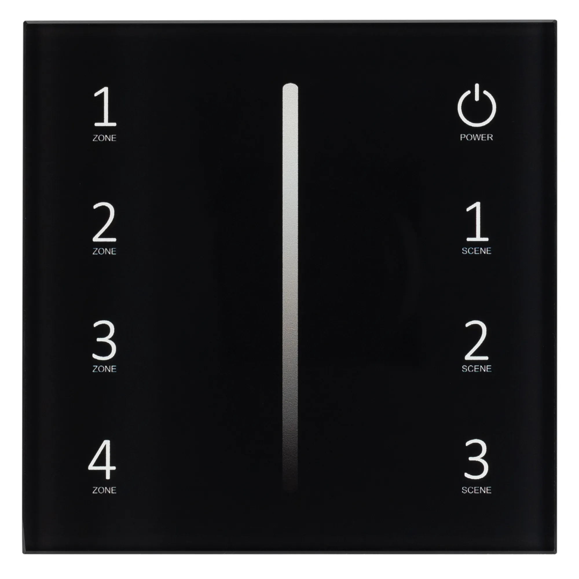 Встраиваемая сенсорная стеклянная панель 2.4 ГГц, цвет чёрный. Для управления яркостью с помощью сенсорной полосы. Питание/рабочее напряжение AC 85-265V, 4 зоны управления, память 4 сцен. Функция управления DMX512 устройствами. Габариты 86х86х36 мм. Панель совместима с диммерами SMART.