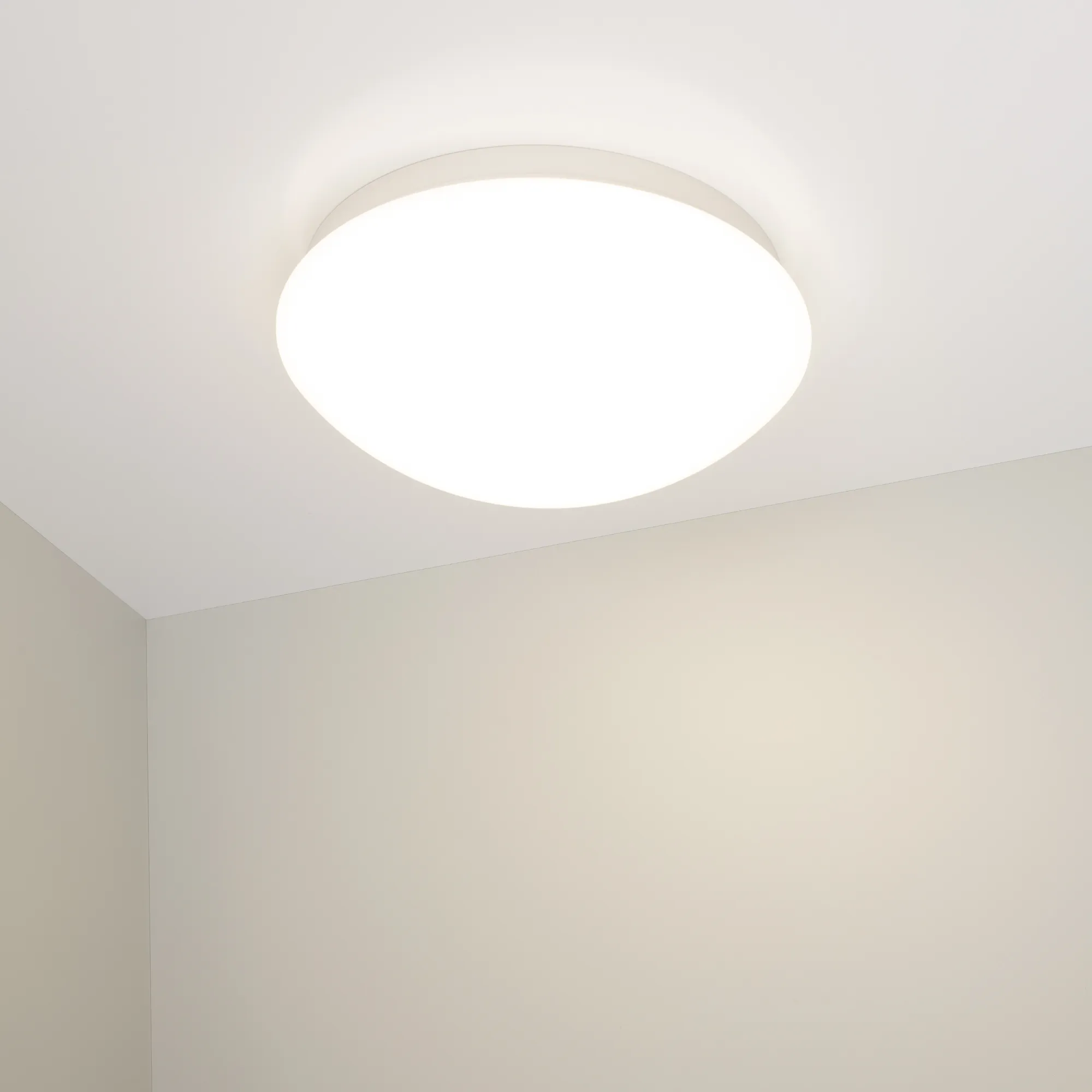 Накладной светильник. Мощность 8Вт, св. поток 550 лм, 80лм/Вт, дневной 4000 K, CRI>80, угол 120°, напряжение питания 230 В. Круглый пластиковый корпус, плафон пластик, степень защиты IP44. Размер: диаметр 180 мм, высота 75 мм. Монтаж накладной. Драйвер встроенный, пульсация <5%.