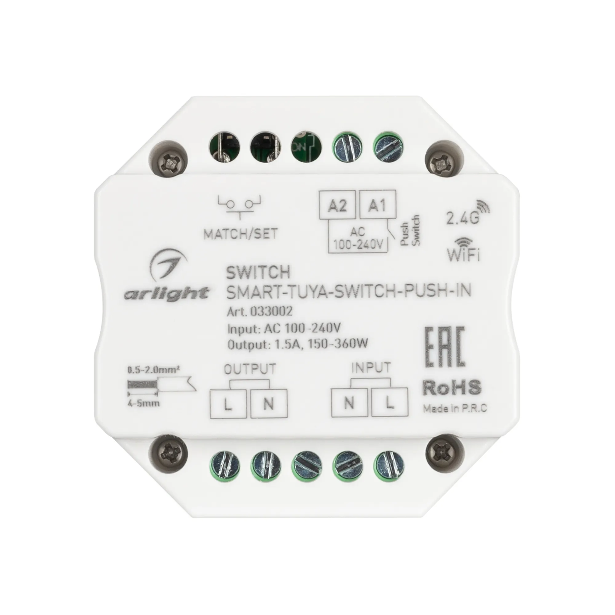 Контроллер-выключатель SMART-TUYA-SWITCH-PUSH-IN (230V, 1.5A, WiFi, 2.4G) (Arlight, IP20 Пластик, 5 лет)