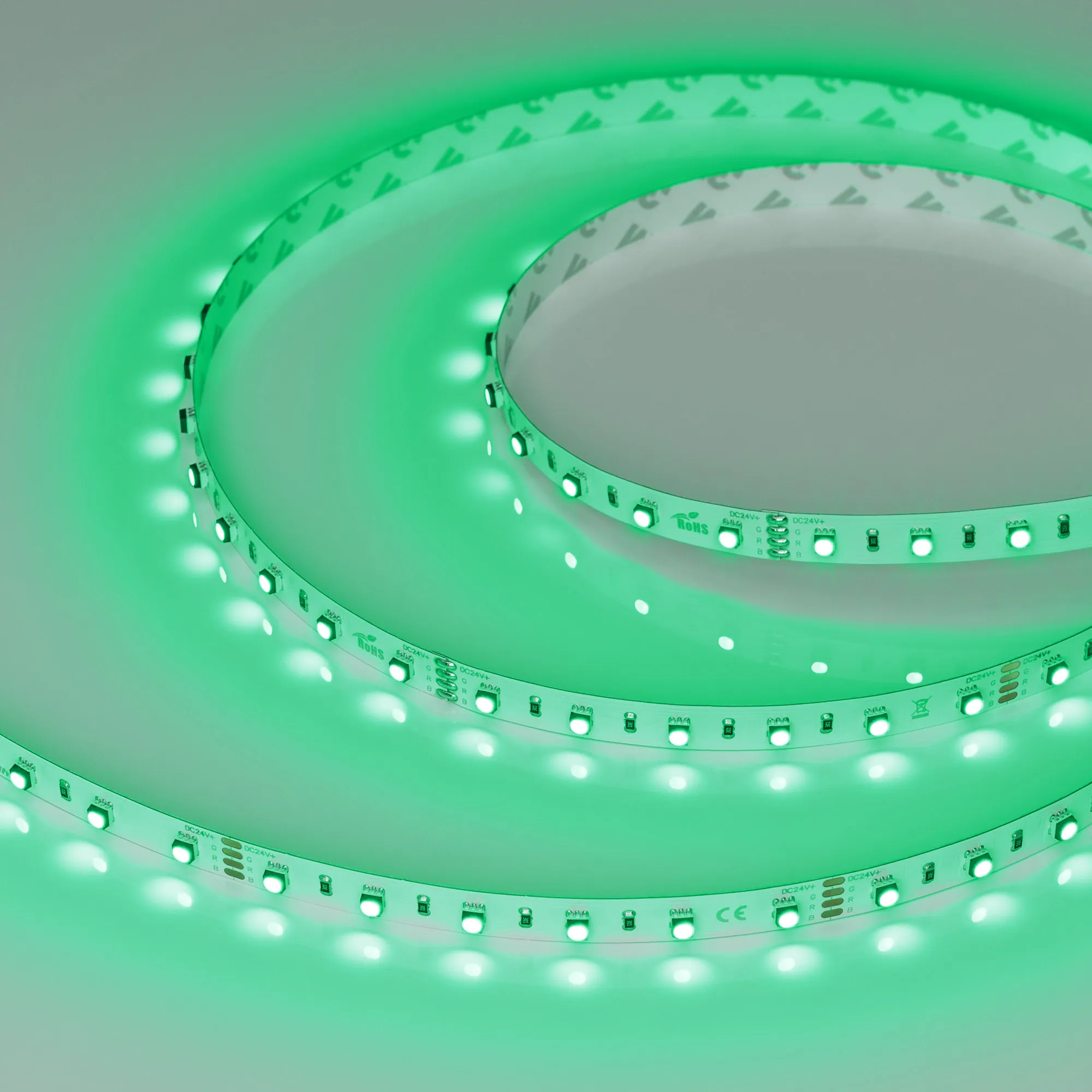 Мультицветная светодиодная лента MINI серии F60. Светодиоды SMD 3535, 60 шт/м, белая плата шириной 10 мм, скотч 3M. Цвет RGB, угол 120°. Питание 24 В, мощность 14.4 Вт/м (72 Вт на 5 м). Размеры 5000x10x3.1 мм. Мин. отрезок 100 мм, 6 светодиодов. Цена за 1 м.