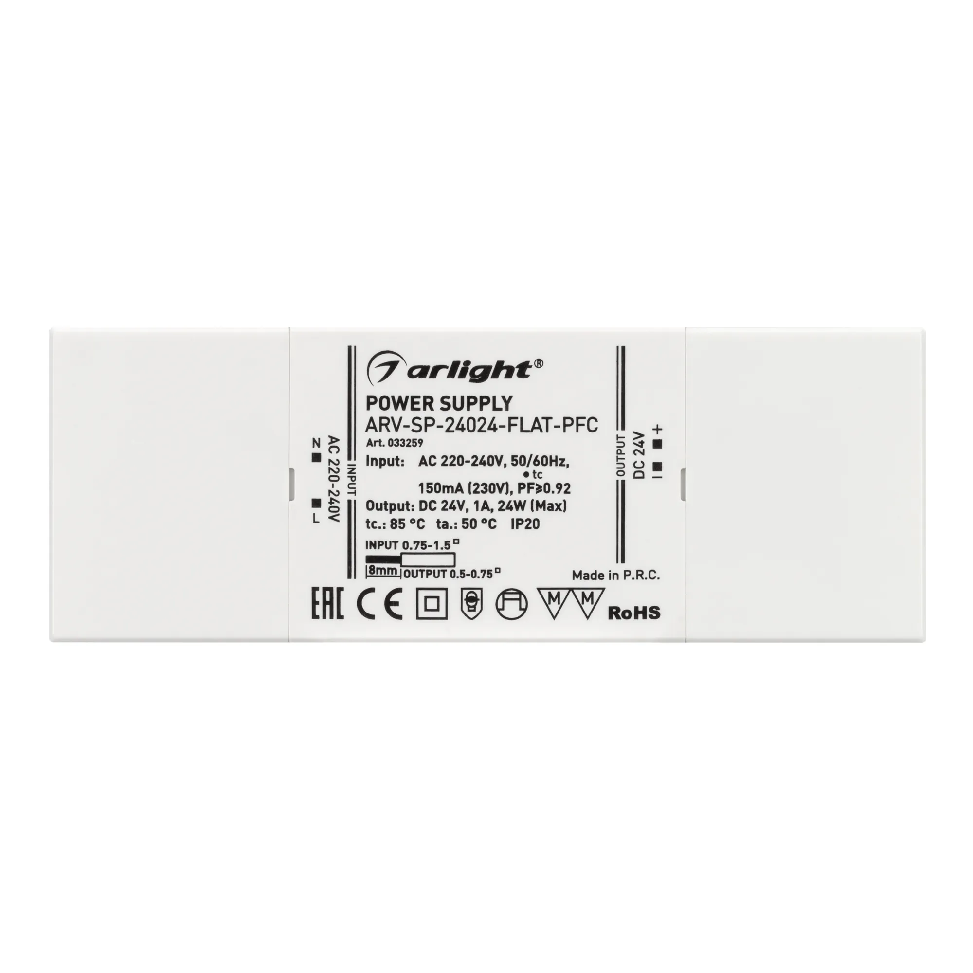 Блок питания ARV-SP-24024-FLAT-PFC (24V, 1A, 24W) (Arlight, IP20 Пластик, 5 лет)
