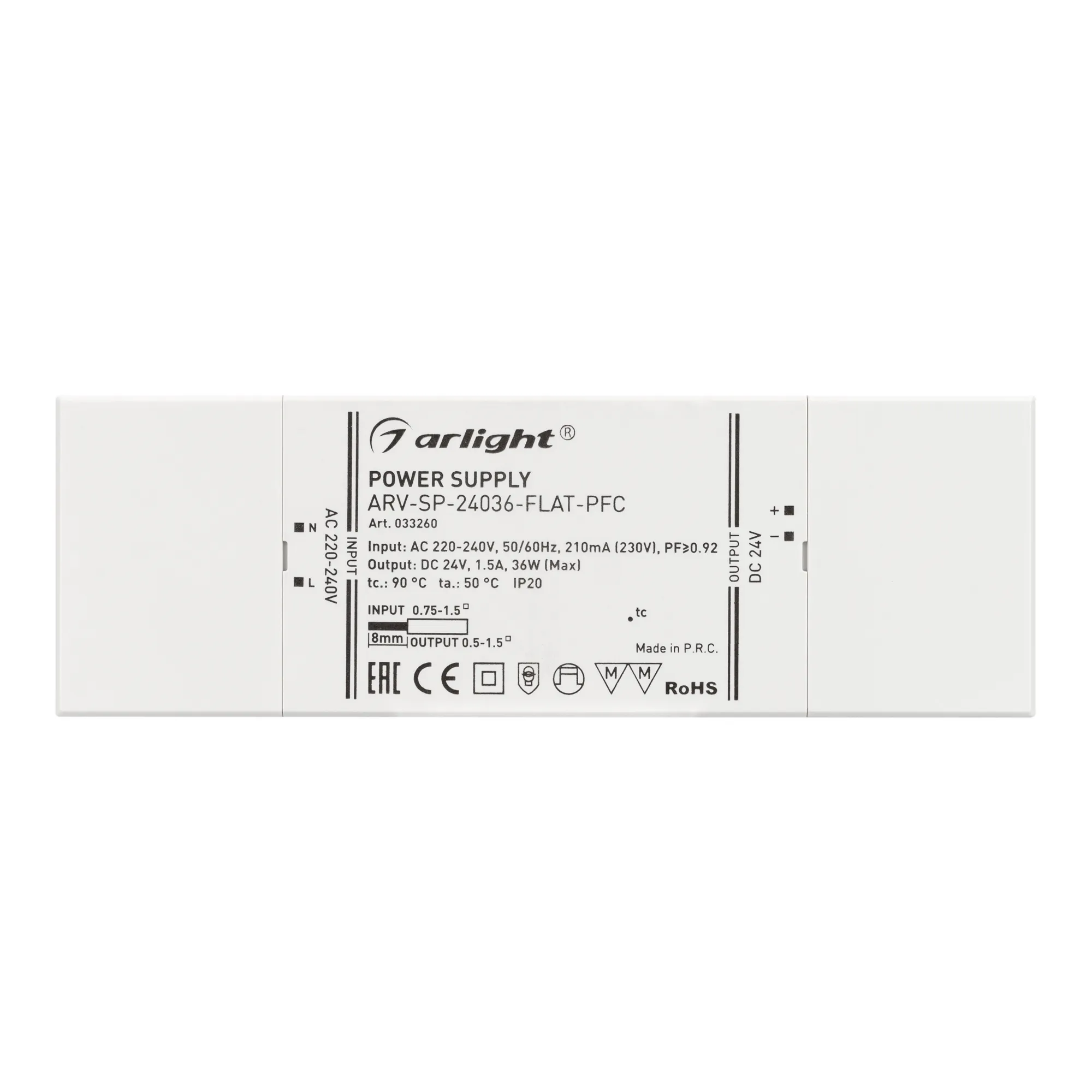 Блок питания ARV-SP-24036-FLAT-PFC (24V, 1.5A, 36W) (Arlight, IP20 Пластик, 5 лет)