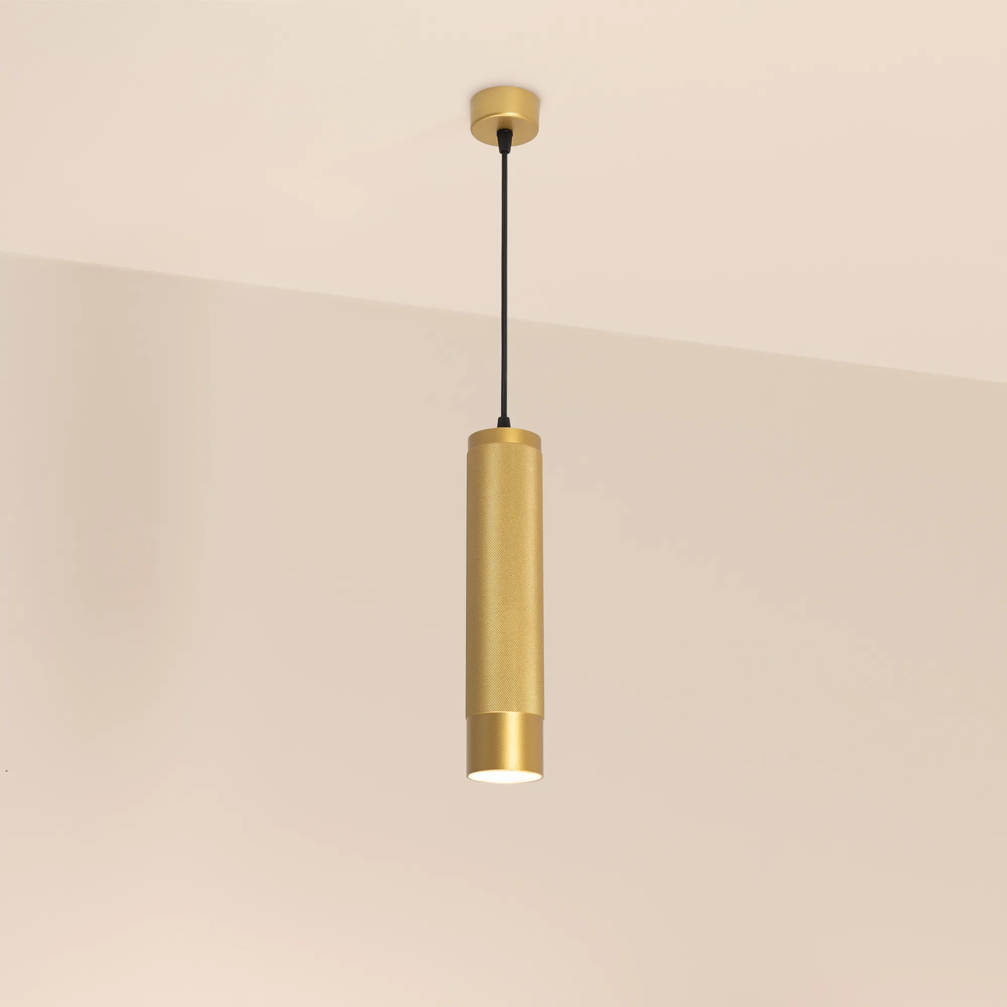 Подвесной светильник. Мощность 13 Вт, св. поток 732 лм, 57 лм/Вт, теплый 3000 K, CRI>90, угол 50°, напряжение питания 230 В. Золотой круглый корпус из алюминия, рефлектор PC, степень защиты IP20. Размер: диаметр 70 мм, высота 300 мм, длина подвеса 1500 мм, размер чаши: диаметр 65 мм, высота 30 мм. Монтаж подвесной. Драйвер 24-42 В, 300 мА, пульсация <1%.
