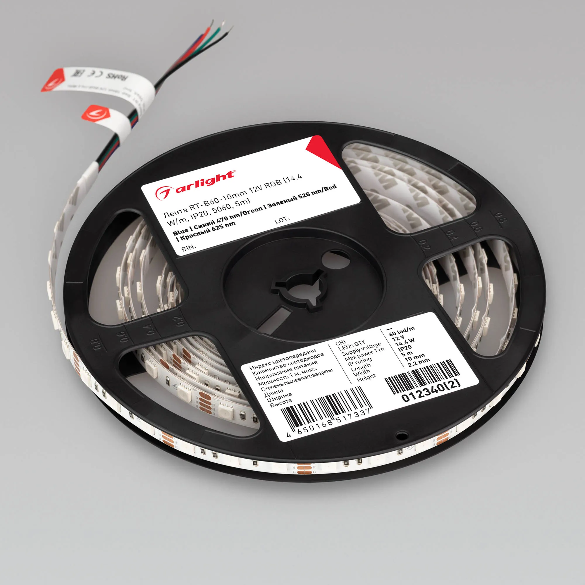 Лента светодиодная RT-B60-10mm 12V RGB (14.4 W/m, IP20, 5060, 5m) (Arlight, Открытый)