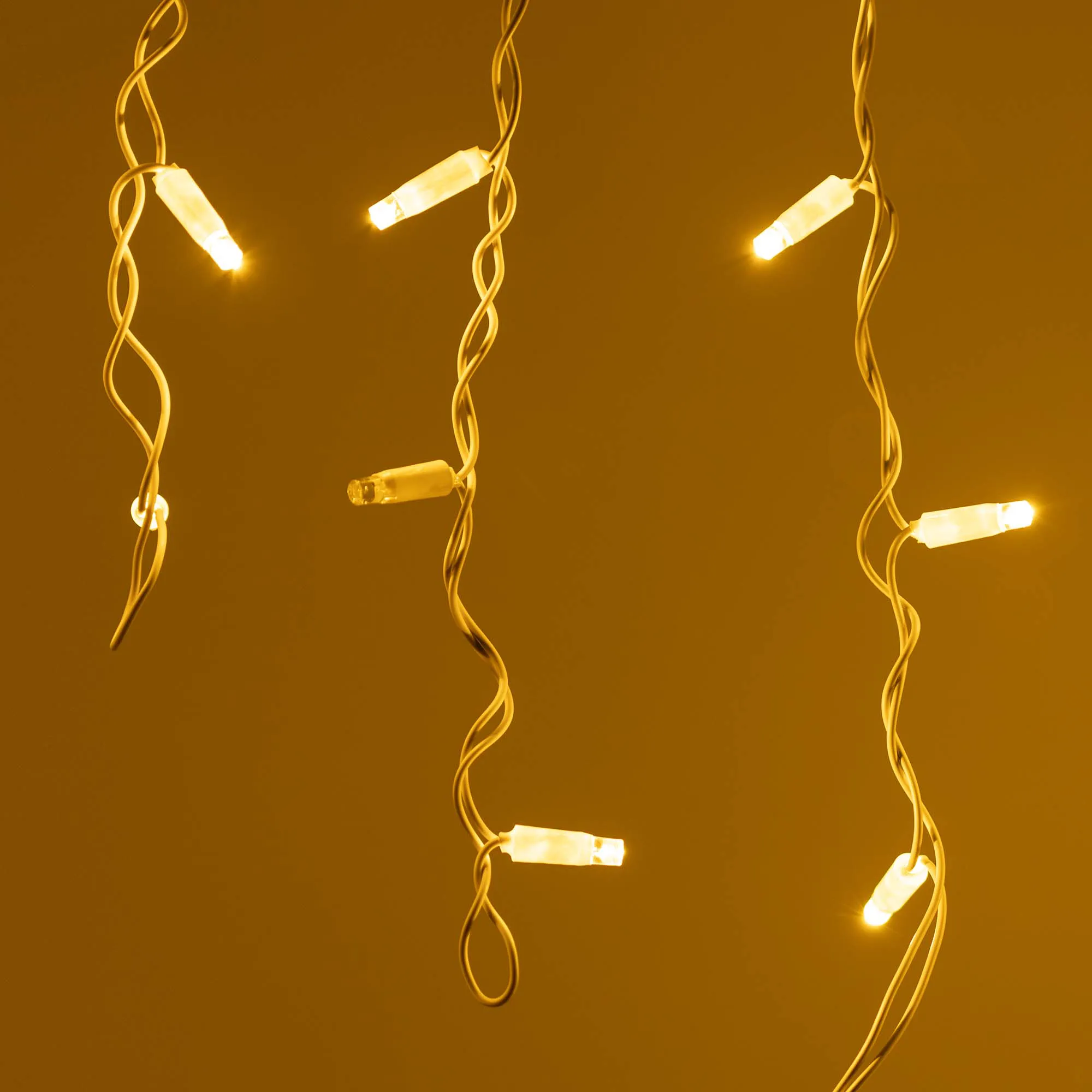 Светодиодная бахрома Classic. Размер 2400 мм (длина 2400 мм, по длине 24 нити высотой 200/600 мм). Количество светодиодов 88 шт размером 7 мм. Основной цвет свечения ТЕПЛЫЙ БЕЛЫЙ (3000 К), эффект мерцания редких точек (ТЕПЛЫЙ БЕЛЫЙ 3000К) с мягким световым рисунком (выпуклая молочно-белая линза), соотношение светодиодов: 66 теплых постоянного свечения / 12 теплых с мерцанием. Эффект частого мерцания. Провод белый, ПВХ. Питание 230 В, Мощность 6 Вт, защита IP65, применение на улице под навесом. Аксессуары для подключения приобретаются отдельно.