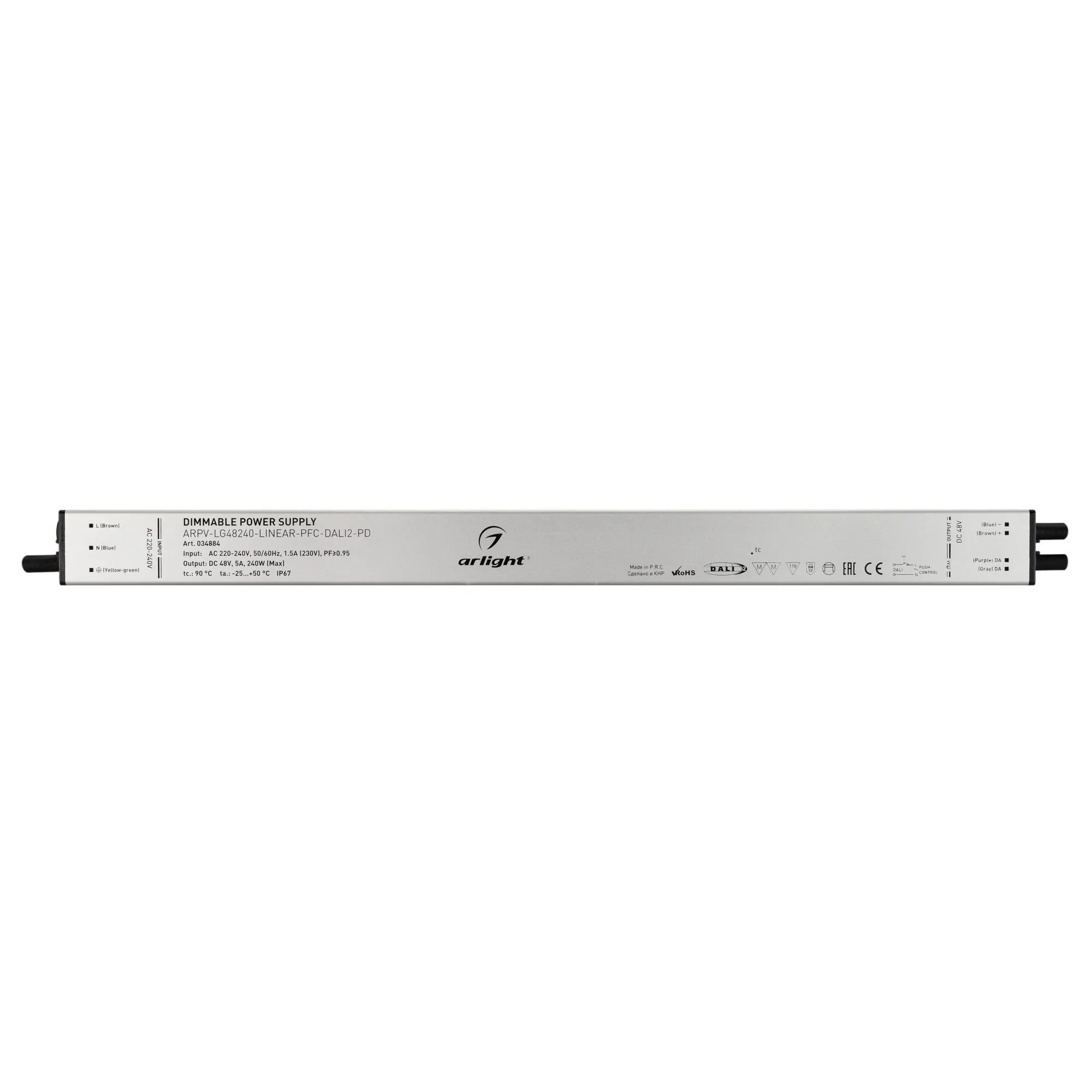 Диммируемый блок питания 48V с гальванической развязкой, ток 5А, 240Вт, с управлением DALI, c функцией PUSH-DIM, с корректором мощности, PF>0,95. Тонкий металлический корпус IP67. Вход: 220-240VAC. Выход: 48VDC, ШИМ 1кГц. Размер 400х30х21 mm.. Совместимость со стандартом EMC. Гарантия 5 лет. Допускается использование только внутри помещений.