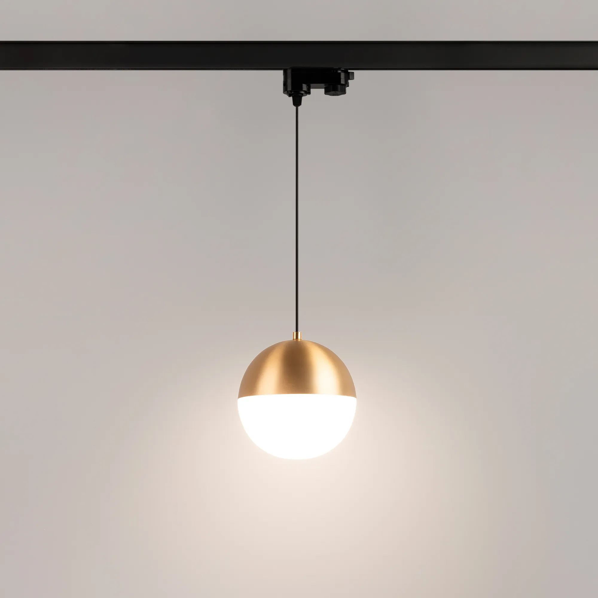 Светильник для треков/шин 4 провода. Мощность 11 Вт, св. поток 960 лм, 80 лм/Вт, дневной 4000 K, CRI>90, угол 170°, напряжение питания 230 В. Золотой корпус из алюминия, материал плафона стекло, степень защиты IP20. Размер: диаметр 150 мм, длина подвеса 1500 мм. Монтаж на трек 3-фазный. Драйвер 28-42 В, 250 мА, пульсация <1%.