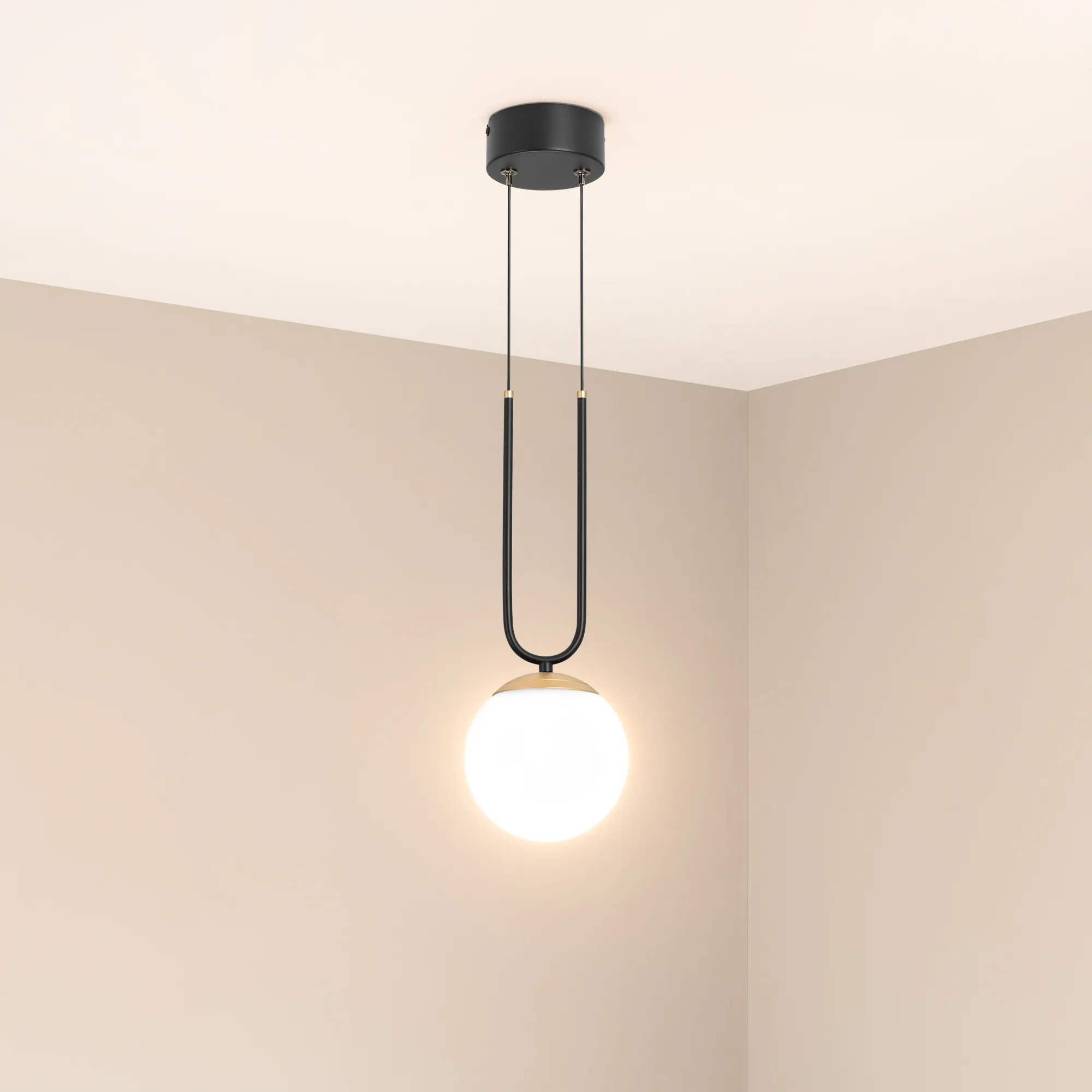 Подвесной светильник. Мощность 10 Вт, св. поток 710 лм, 71 лм/Вт, теплый 3000 K, CRI>90, угол 275°, напряжение питания 230 В. Черно-золотой круглый корпус из алюминия и стали, рассеиватель стекло, степень защиты IP20. Размер: диаметр 130 мм, высота ножки 220 мм, высота с плафоном 357 мм, размер чаши: диаметр 100 мм, высота 40 мм. Монтаж подвесной, длина подвеса 1140 мм. Драйвер 6-14 В, 600 мА, пульсация <1%.