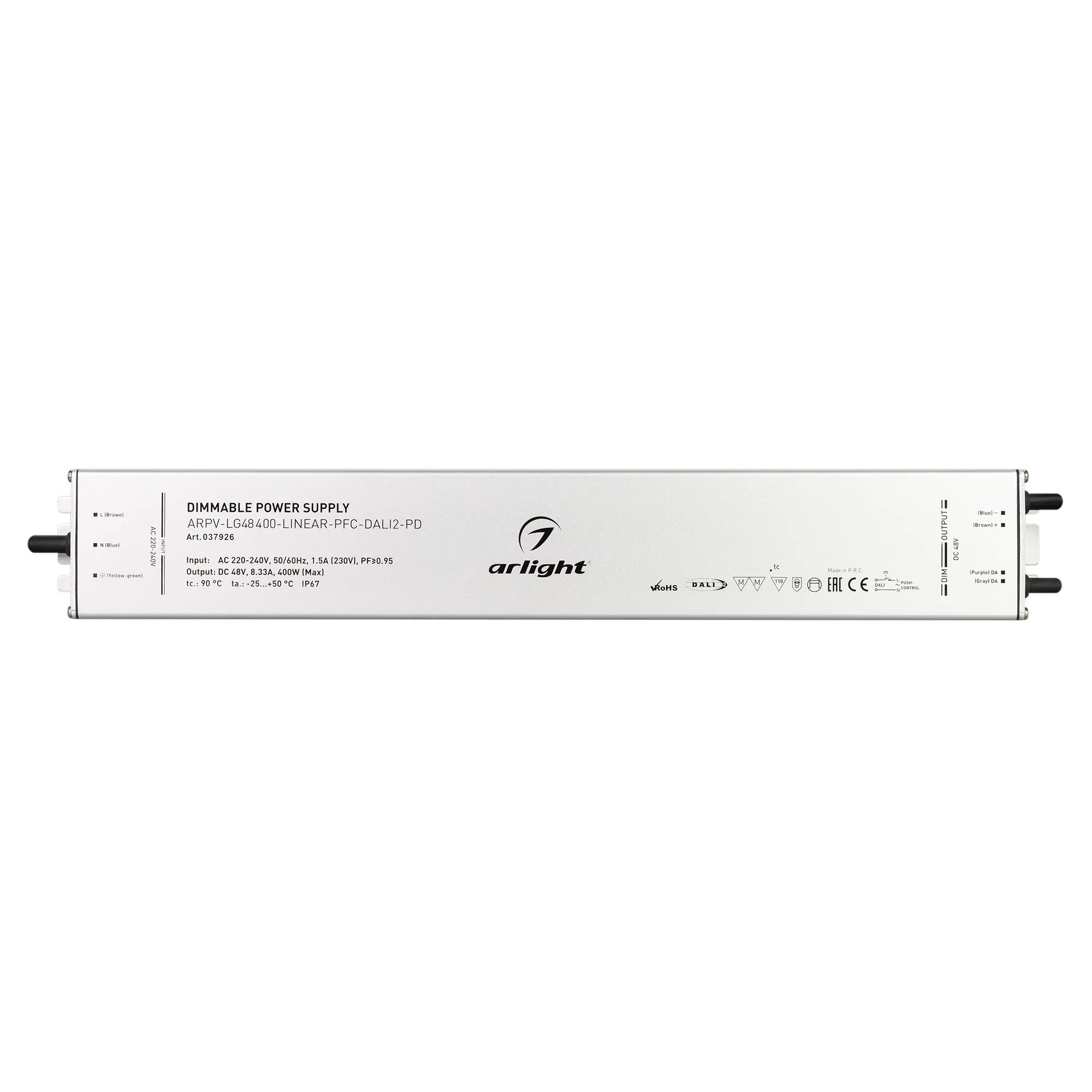 Диммируемый блок питания 48V с гальванической развязкой, ток 8.3А, 400Вт, с управлением DALI, c функцией PUSH-DIM, с корректором мощности, PF>0,95. Тонкий металлический корпус IP67. Вход: 220-240VAC. Выход: 48VDC, ШИМ 1кГц. Размер 400х55х22 mm.. Совместимость со стандартом EMC. Гарантия 5 лет. Допускается использование только внутри помещений.