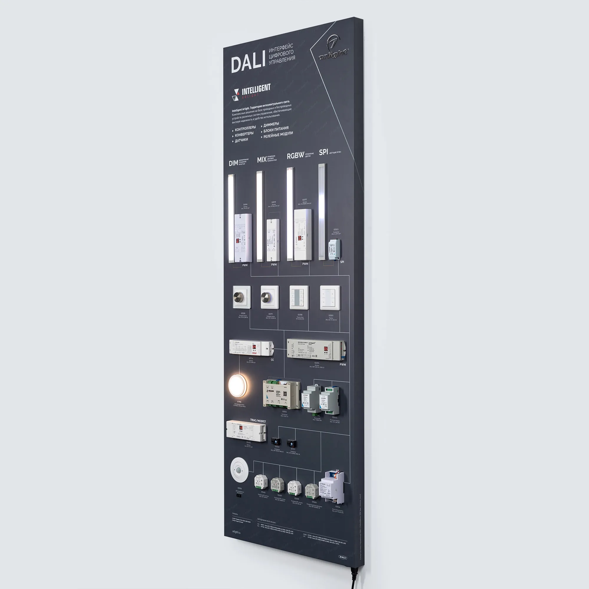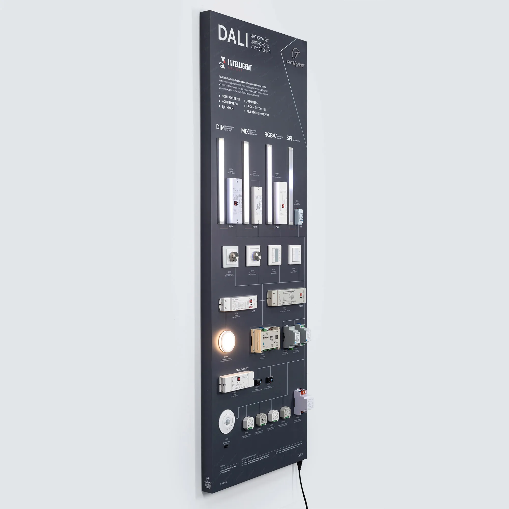 Наши специалисты знают все о продукции Arlight и с радостью помогут Вам выбрать комплектующие к товару "Стенд Системы Управления DALI 1760x600mm (DB 3мм, пленка, лого) (Arlight, -)", или другие товары из раздела "Управление светом".