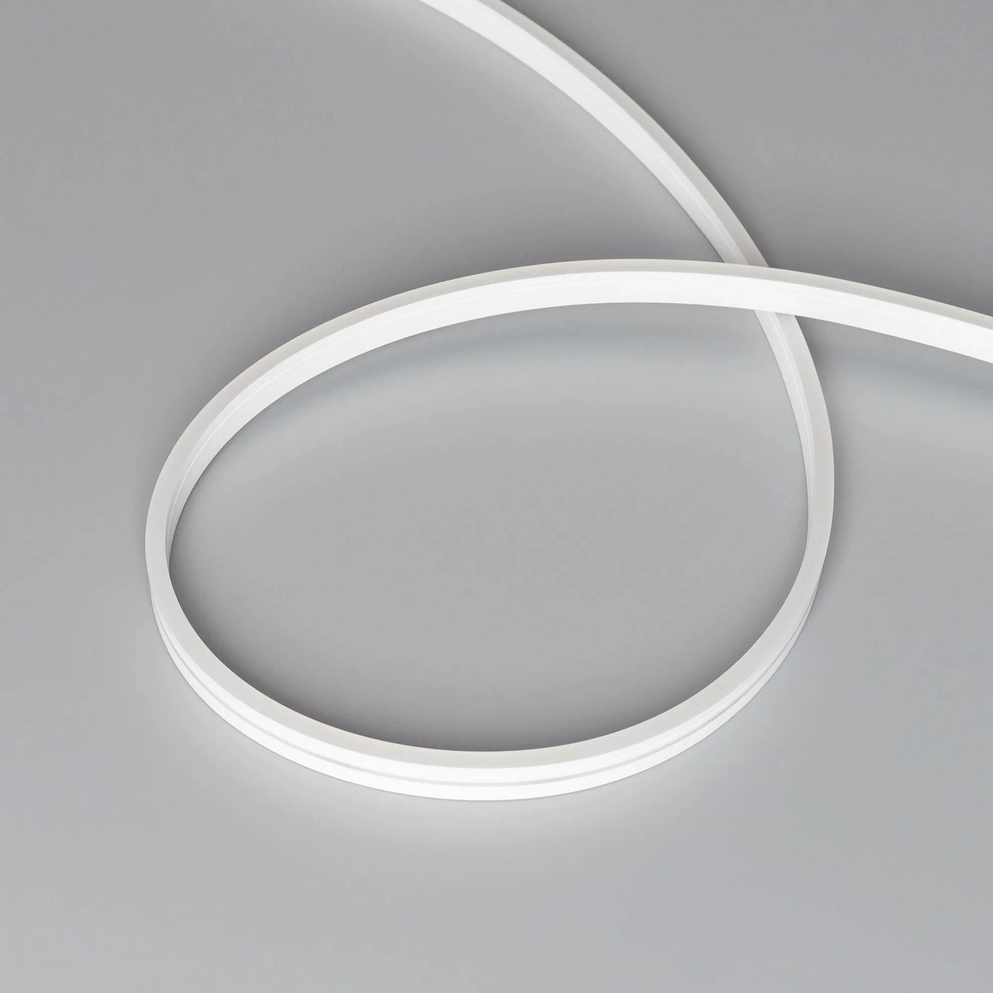 Гибкая герметичная лента (неон серии MOONLIGHT), сечение 4×10 мм. Светодиоды SMD 2835 168 шт/м. Цвет свечения ТЁПЛЫЙ БЕЛЫЙ (2700 К), индекс цветопередачи CRI>90, световой поток 240 лм/м, угол излучения 110°. Мощность 7.2 Вт/м, питание 24 В. Класс пылевлагозащиты IP65. Размеры 5000×10×4 мм. Мин. отрезок 41.66 мм. Горизонтальный изгиб SIDE, минимальный радиус изгиба 30 мм. Вывод кабеля с двух сторон. Катушка 5 м. Цена за 1 м. Гарантия 3 года.