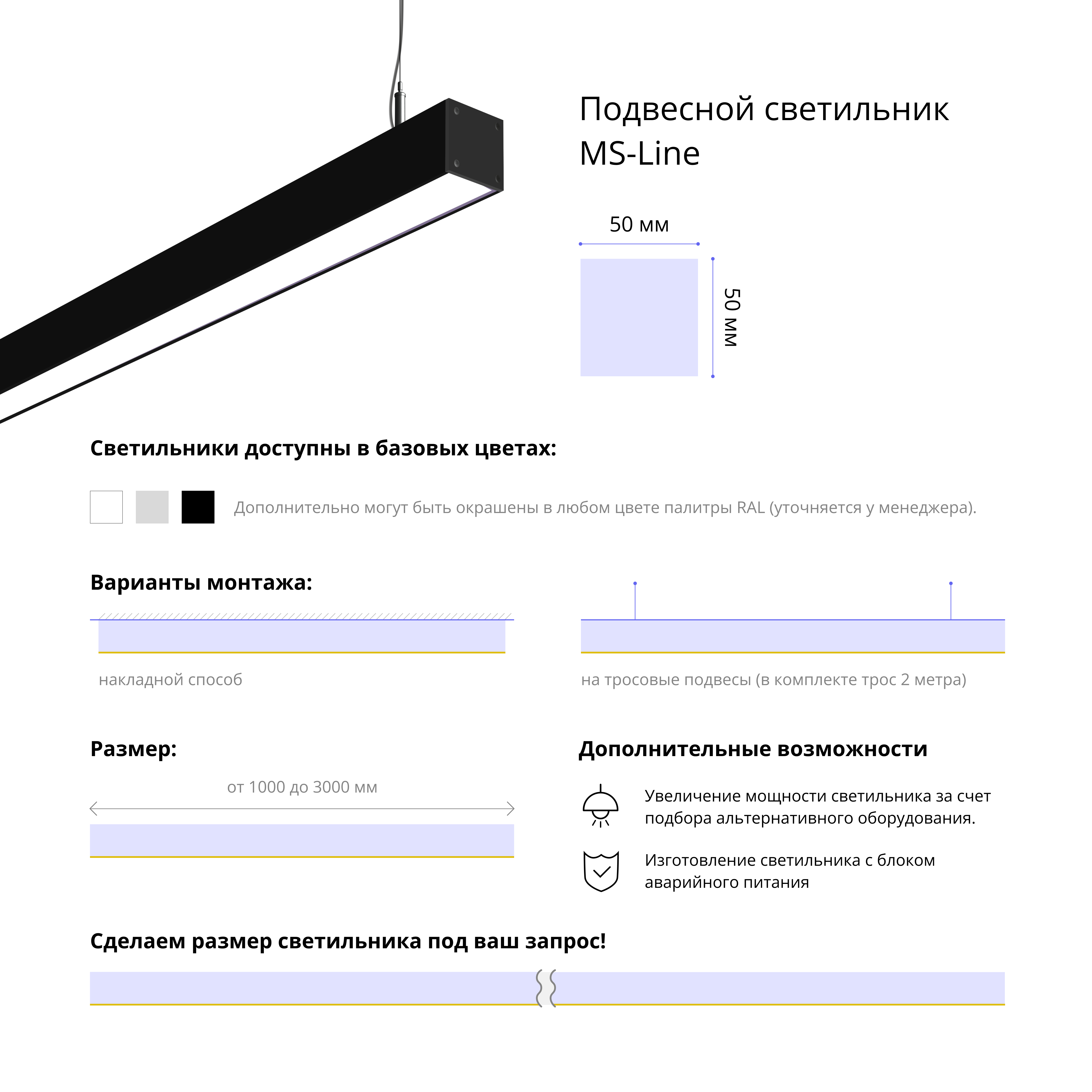 Светодиодный линейный светильник MS-LINEAR Линейный размер профиля 50x50мм длиной 2500мм мощностью 100W. Светильник собирается в алюминиевом корпусе с матовым рассеивателем, который дает равномерную засветку по всей площади.