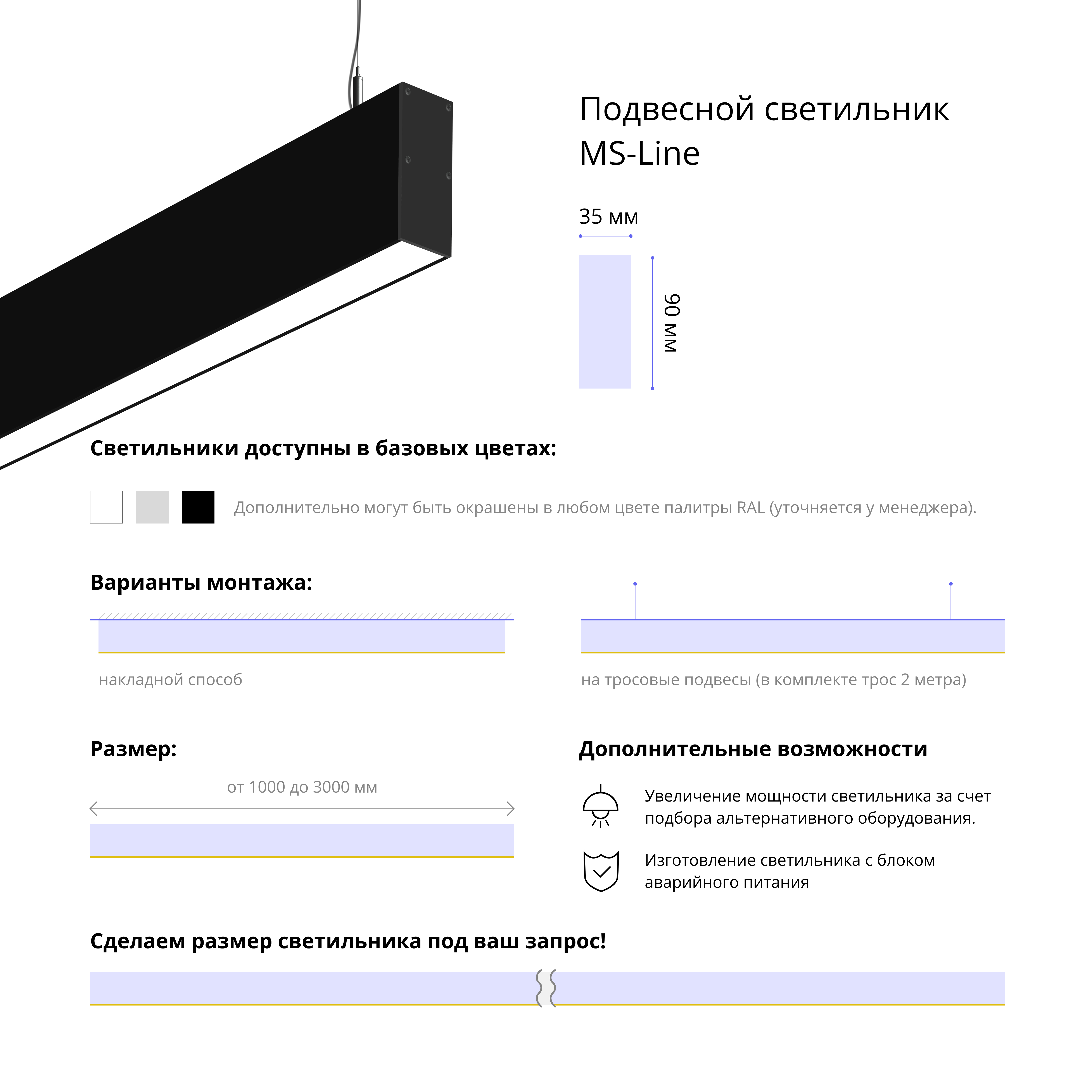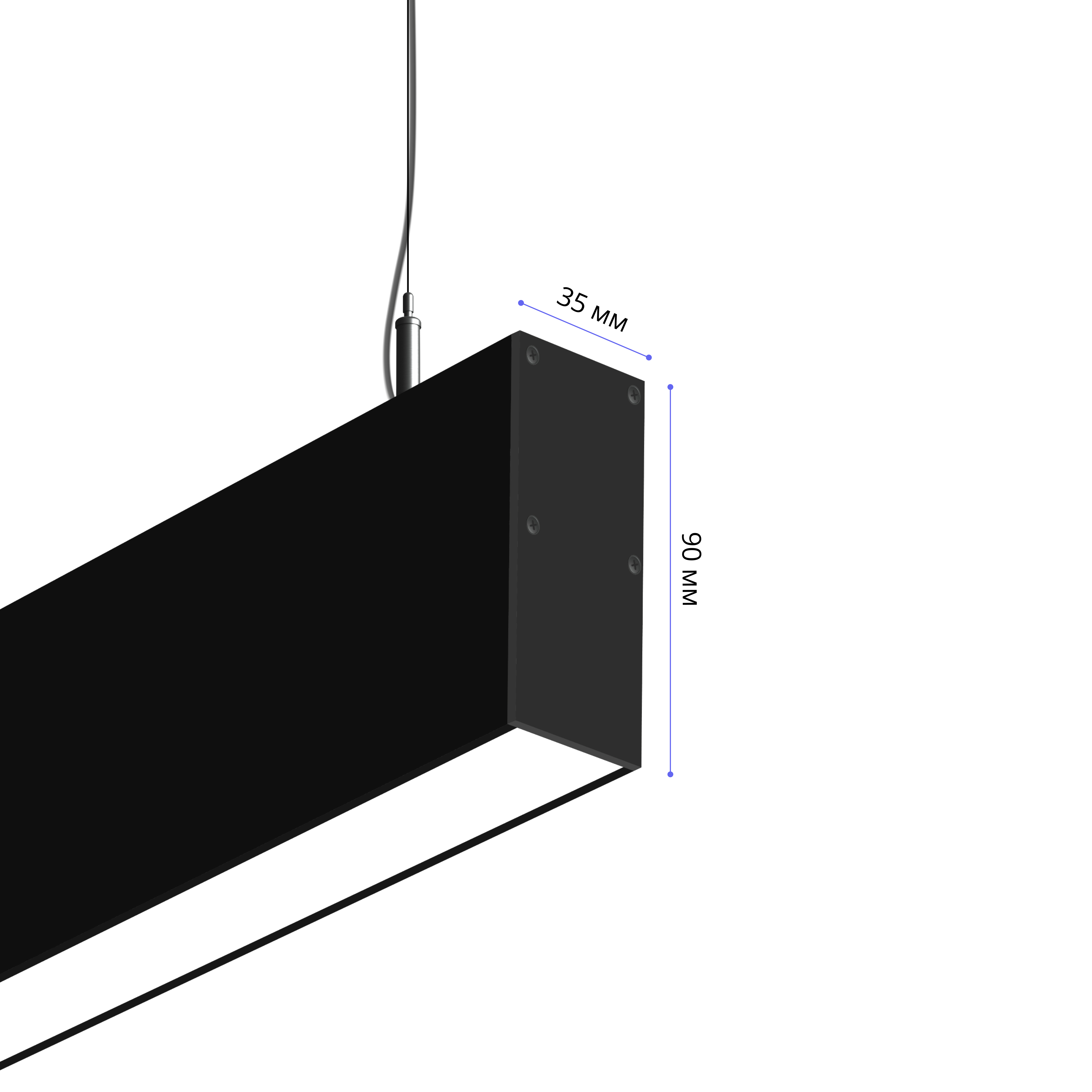Подвесной светильник MS-LINEAR Линейный размер профиля 90х35мм длиной 2500мм мощностью 40W. Светильник собирается в алюминиевом корпусе с матовым рассеивателем, который дает равномерную засветку по всей площади.
