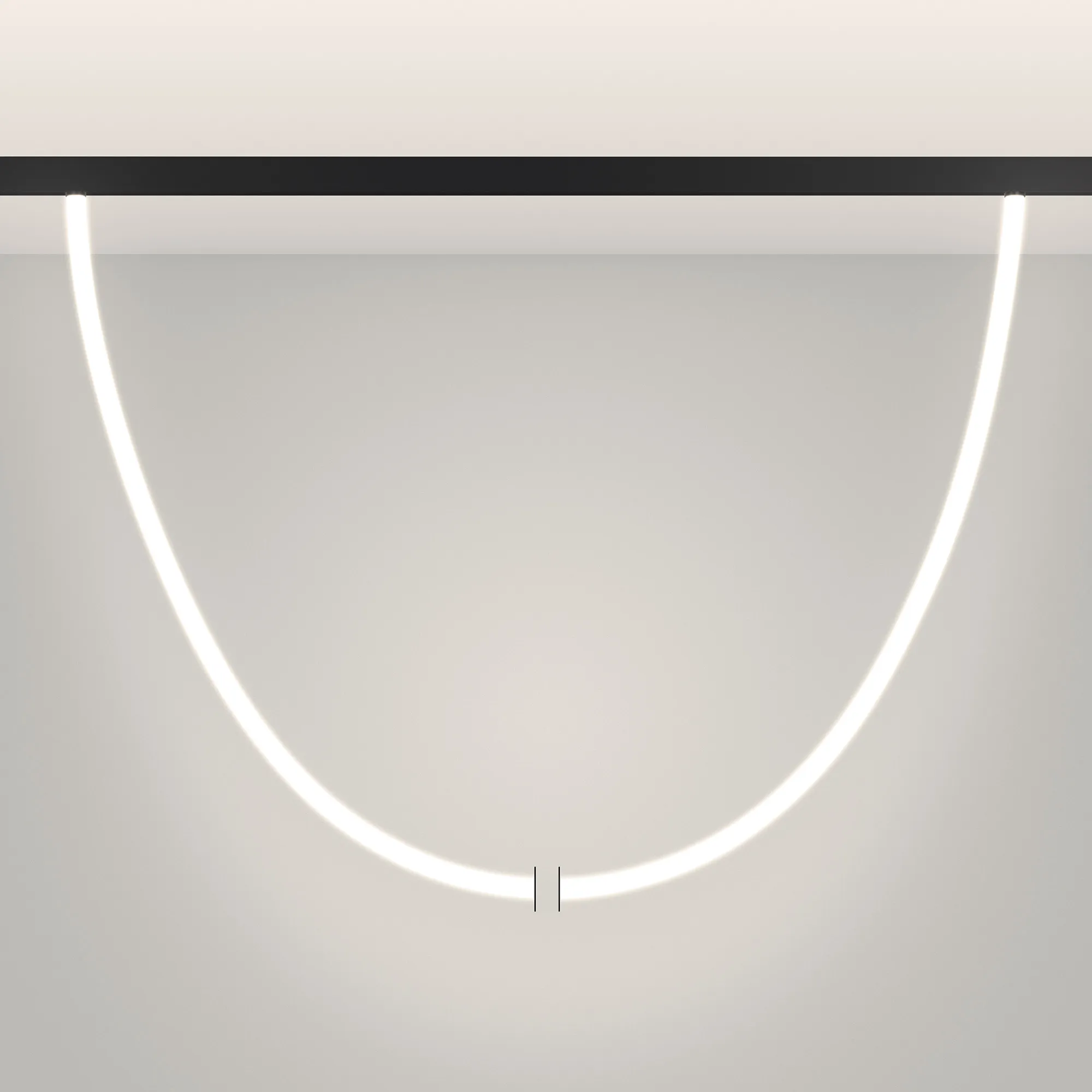 Светильник гибкий для магнитных треков серии ORIENT с управлением DALI. Мощность 70 Вт, св. поток 4550 лм, 65 лм/Вт, дневной 4000 K, CRI>90, угол 360°, напряжение питания 48 В. Матовый белый фигурный корпус из силикона с черными креплениями. Размер: диаметр 25 мм, длина 5000 мм. Монтаж на магнитный трек ORIENT. Адаптеры входят в комплект.