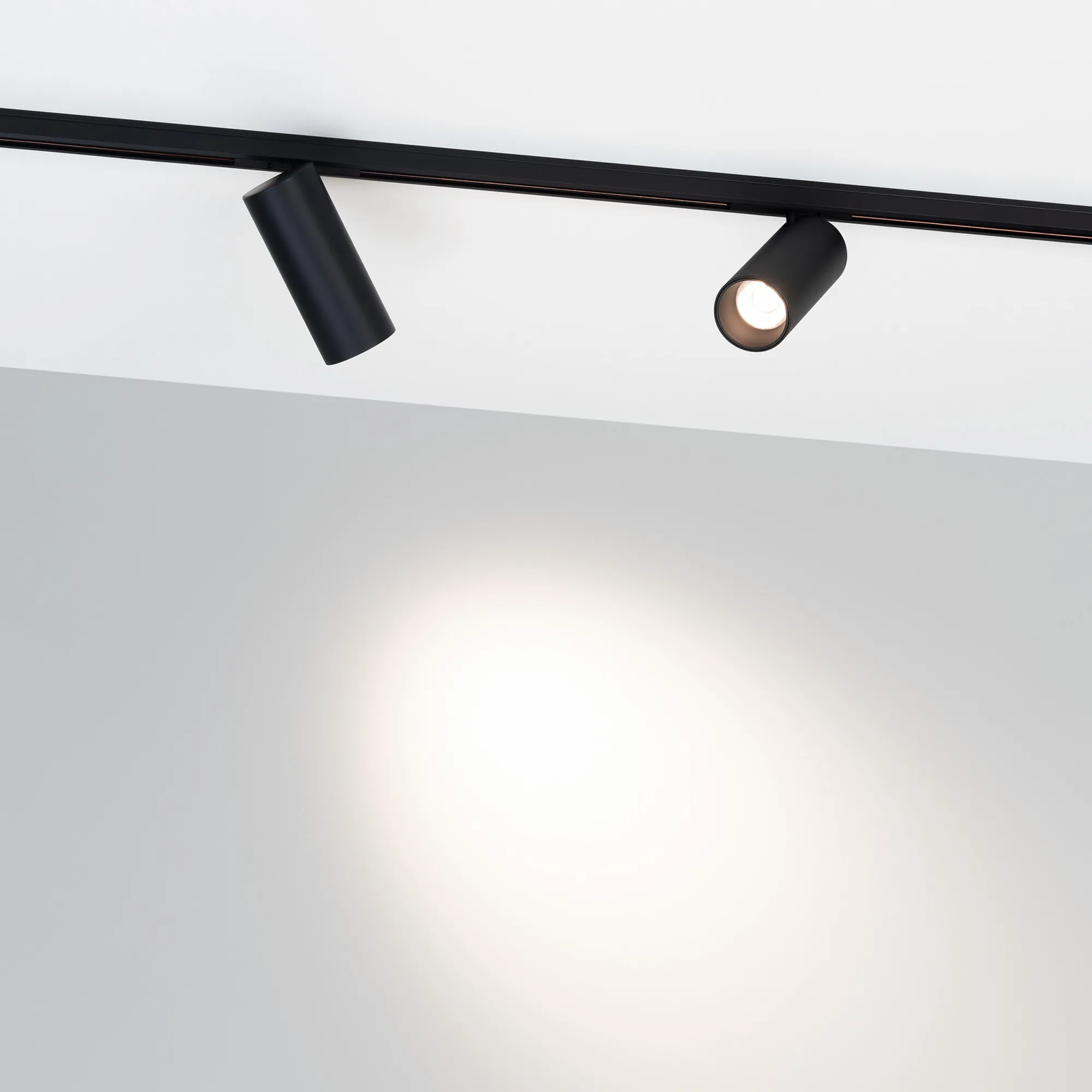 Светильник для магнитных треков MAG-MICROCOSM шириной 11 мм. Мощность 5 Вт, св. поток 373 лм, 75 лм/Вт, дневной 4000 K, CRI>90, угол 36°, напряжение питания 24 В. Черный фигурный корпус из алюминия, экран поликарбонат, степень защиты IP20. Размер: диаметр 35 мм, высота 83 мм. Монтаж на трек MICROCOSM. Пульсация <1%. Не диммируется. Преобразователь напряжения DC-DC.