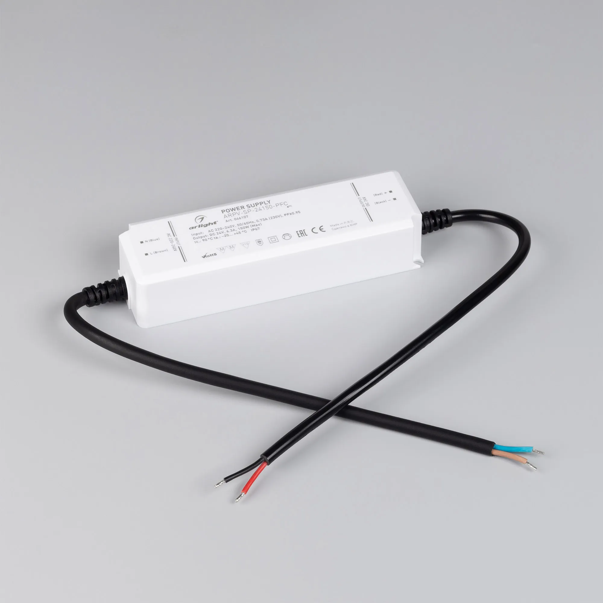 Источник напряжения с гальванической развязкой для светодиодных изделий. Входное напряжение 220-240 VAC. Выходные параметры: 24 В, 6,3 А, 150Вт. Встроенный PFC >0.95. Герметичный пластиковый корпус IP 67. Рабочая температура -20…+45C⁰. Габаритные размеры длина 156 мм, ширина 48 мм, высота 33 мм. Гарантийный срок 5 лет.