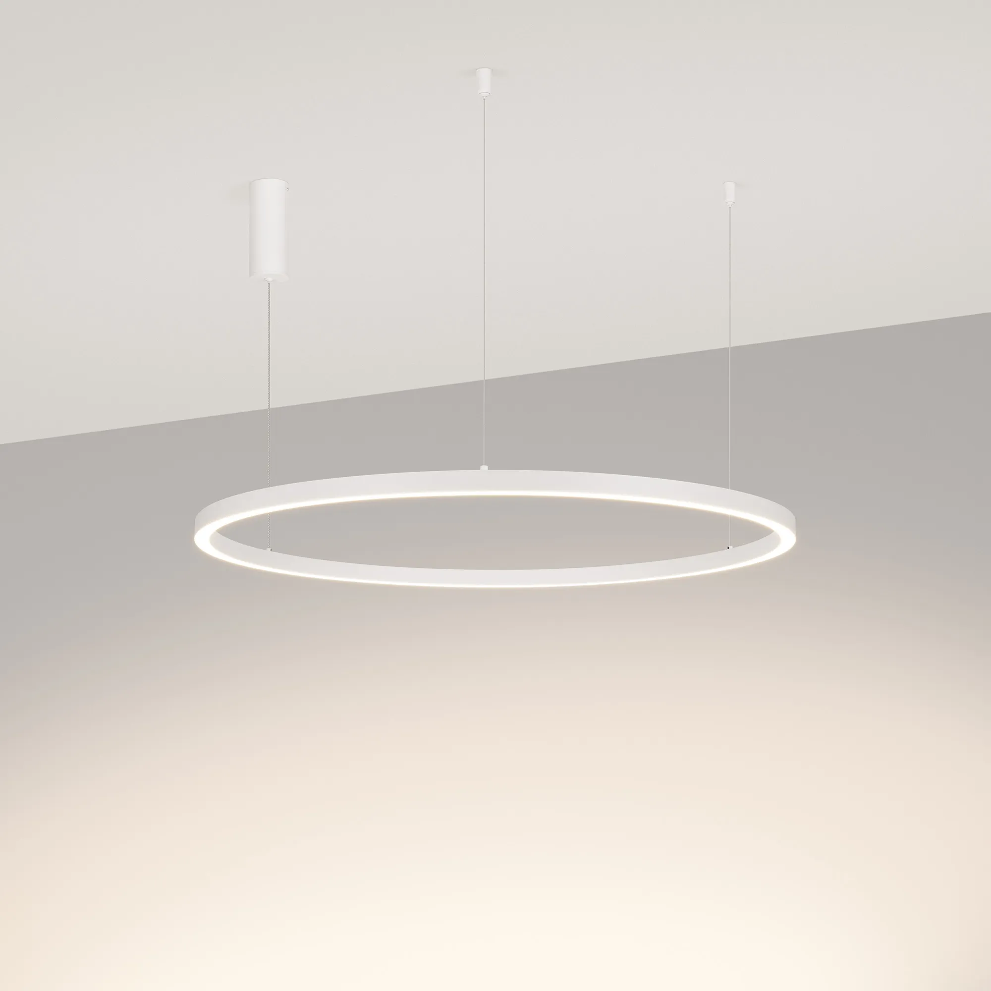 Подвесной светильник. Мощность 42 Вт, св. поток 2500 лм, 60 лм/Вт, дневной 4000 K, CRI>90, угол 120°, напряжение питания 230 В. Белый круглый корпус из алюминия, экран силикон, степень защиты IP20. Размер: диаметр 800 мм, высота 25 мм, ширина профиля 25 мм, размер чаши: диаметр 60 мм, высота 150 мм, драйвер:115 x 40 x 28 мм, 33-40В, 1050 мА. Пульсация <5%. Монтаж подвесной, длина подвеса 1200мм.