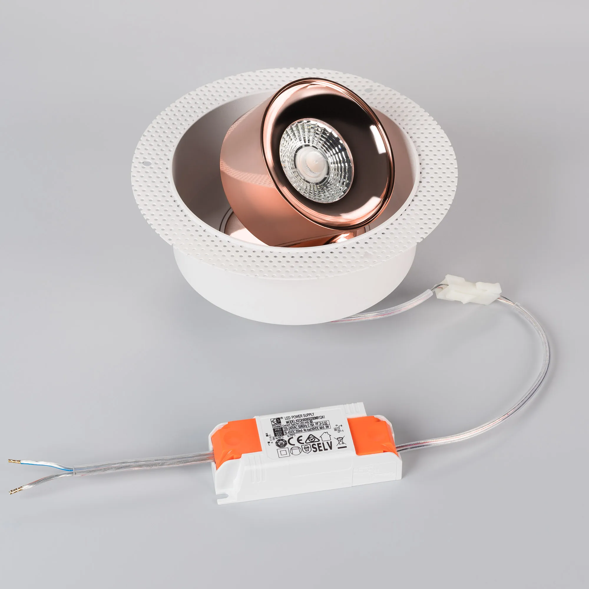 Светильник встраиваемый поворотный безрамочный. Мощность 9 Вт, св. поток 600 лм, 67 лм/Вт, дневной 4000 K, CRI>90, угол 36°, напряжение питания 230 В. Модуль Цвета Медь, Белый круглый корпус из алюминия, экран поликарбонат, степень защиты IP20. Размер: диаметр 160 мм, высота 80 мм. Монтаж встраиваемый, установочное отверстие: диаметр 125 мм. Драйвер 38 В, 200 мА, пульсация <1%.
