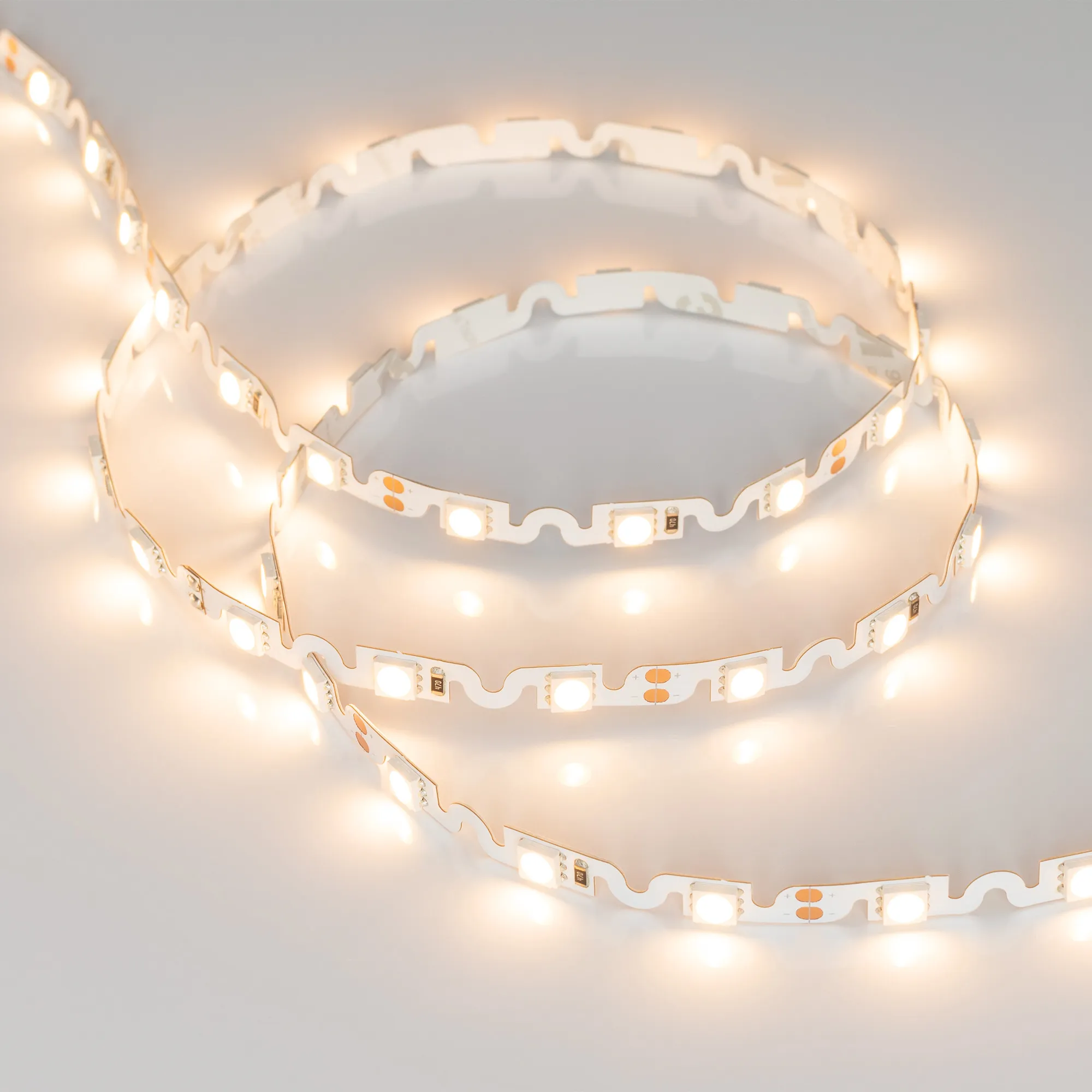 Гибкая лента с фигурной платой в форме волны, легко изгибается на плоскости. Светодиоды smd 5060, 48шт/м (240шт на 5м), белая плата 6.1мм, скотч 3М. Цвет ТЁПЛЫЙ 2600-2800K. Питание 12V, мощность 11.5 Вт/м (57.5 Вт на 5м), угол 120°, цветопередача CRI>85. Размеры 5000х6.1х2.2мм. Мин.отрезок 62.5мм, 3 светодиода. Цена за 1м.