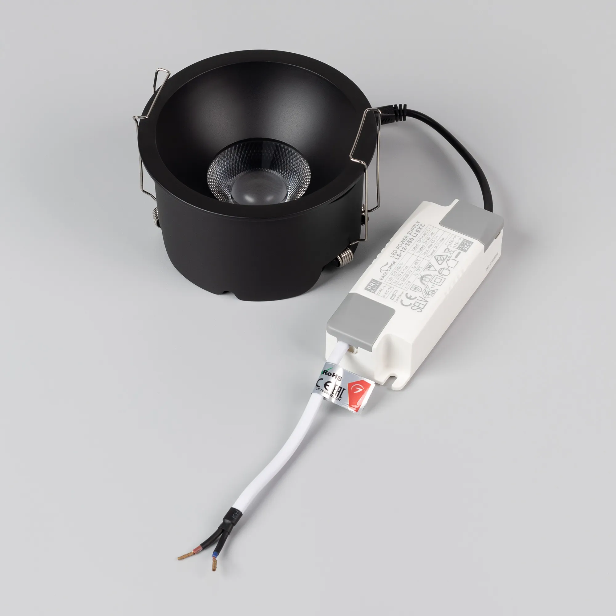 Встраиваемый светильник даунлайт. Мощность 15 Вт, св. поток 1260 лм, 84 лм/Вт, дневной 4000 K, CRI>90, угол 36°, напряжение питания 230 В. Чёрный круглый корпус из алюминия, степень защиты IP20. Размер: диаметр 106 мм, высота 63 мм. Монтаж встраиваемый, установочное отверстие: диаметр 95 мм. UGR<14. Драйвер 27-40 В, 350 мА, пульсация <2%.