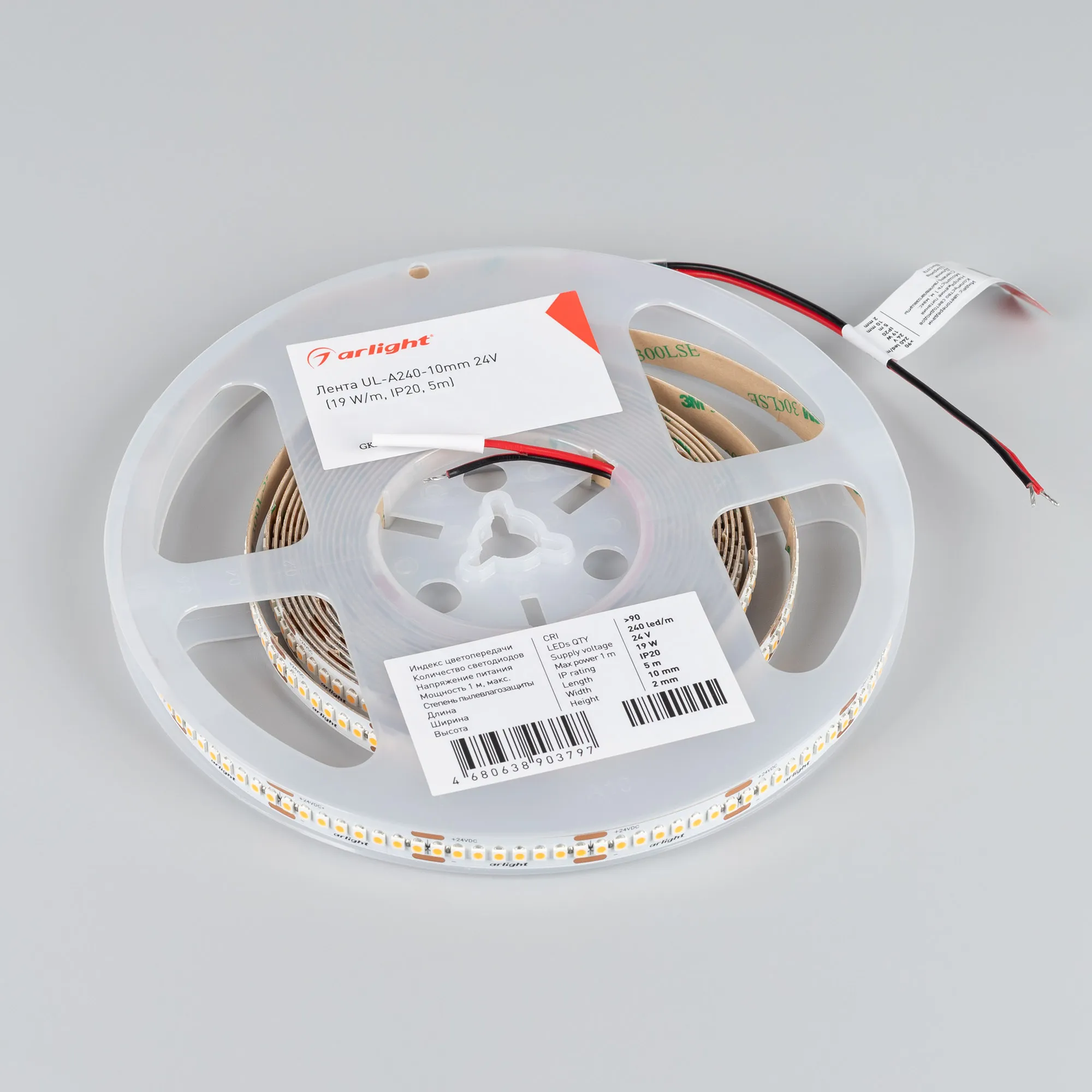 Светодиодная лента UL серии A240. Светодиоды SMD 2835, 240 шт/м, белая плата шириной 10 мм, скотч 3M. Цвет ТЕПЛЫЙ 2400K, индекс цветопередачи CRI>90, угол 120°. Питание 24 В, мощность 19 Вт/м (95 Вт на 5 м). Размеры 5000x10x2 мм. Мин.отрезок 33.33 мм, 8 светодиодов. Цена за 1 м. Обязательная установка на профиль.