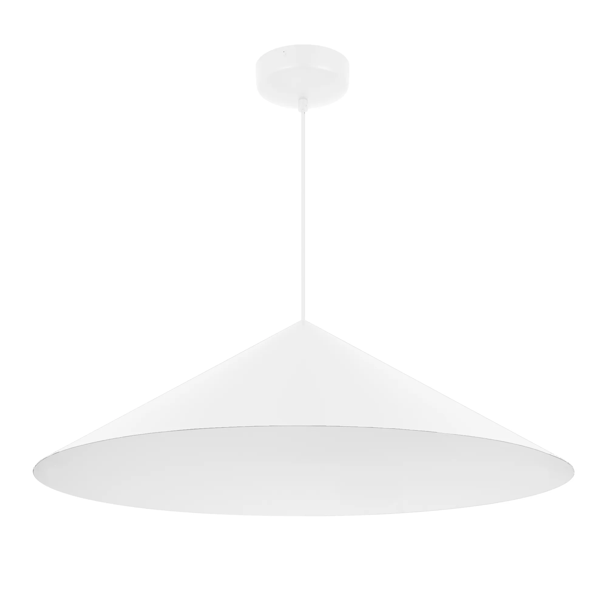 Подвесной светильник. Мощность 14 Вт, св. поток 1200 лм, 90 лм/Вт, теплый 3000 K, CRI>92, угол 36°, напряжение питания 230 В. Белый корпус из алюминия в форме конуса с белой внутренней поверхностью, линза-рассеиватель из PMMA, степень защиты IP20. Размер: диаметр 750 мм, высота 230 мм. Монтаж подвесной, длина подвеса 2000 мм, регулируемая. В комплекте 2 вида чаш. Габариты встраиваемой чаши: Ø 80x23 мм. Габариты накладной чаши Ø140x55 мм. Драйвер 27-42 В, 350 мА, пульсация <1%. Управление по TRIAC.