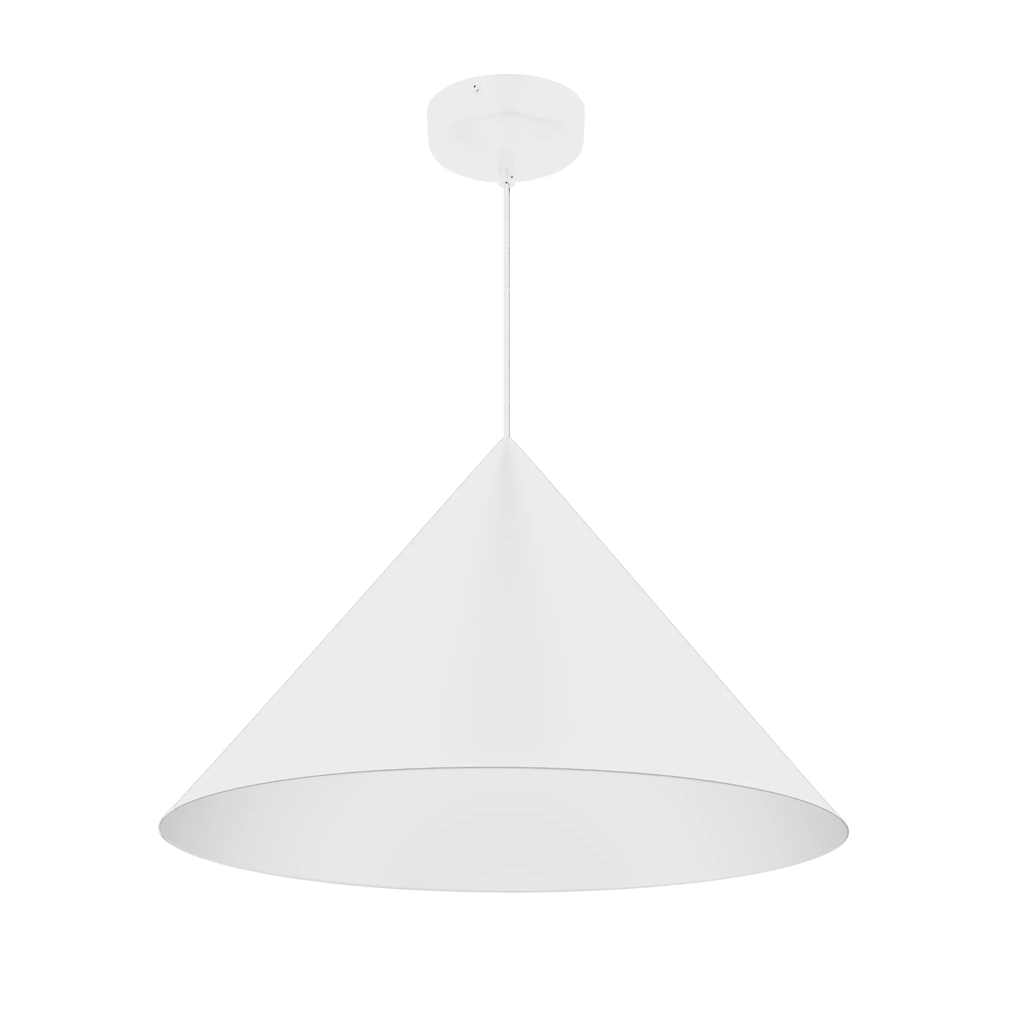 Подвесной светильник. Мощность 14 Вт, св. поток 1200 лм, 74 лм/Вт, тёплый 2700K, CRI>97, угол 36°, напряжение питания 230 В. Белый корпус из алюминия в форме конуса с белой внутренней поверхностью, линза-рассеиватель из PMMA, степень защиты IP20. Размер: диаметр 550 мм, высота 340 мм. Монтаж подвесной, длина подвеса 2000 мм, регулируемая. В комплекте 2 вида чаш. Габариты встраиваемой чаши: Ø 80x23 мм. Габариты накладной чаши Ø140x55 мм. Драйвер 27-42 В, 350 мА, пульсация <1%. Управление по TRIAC.