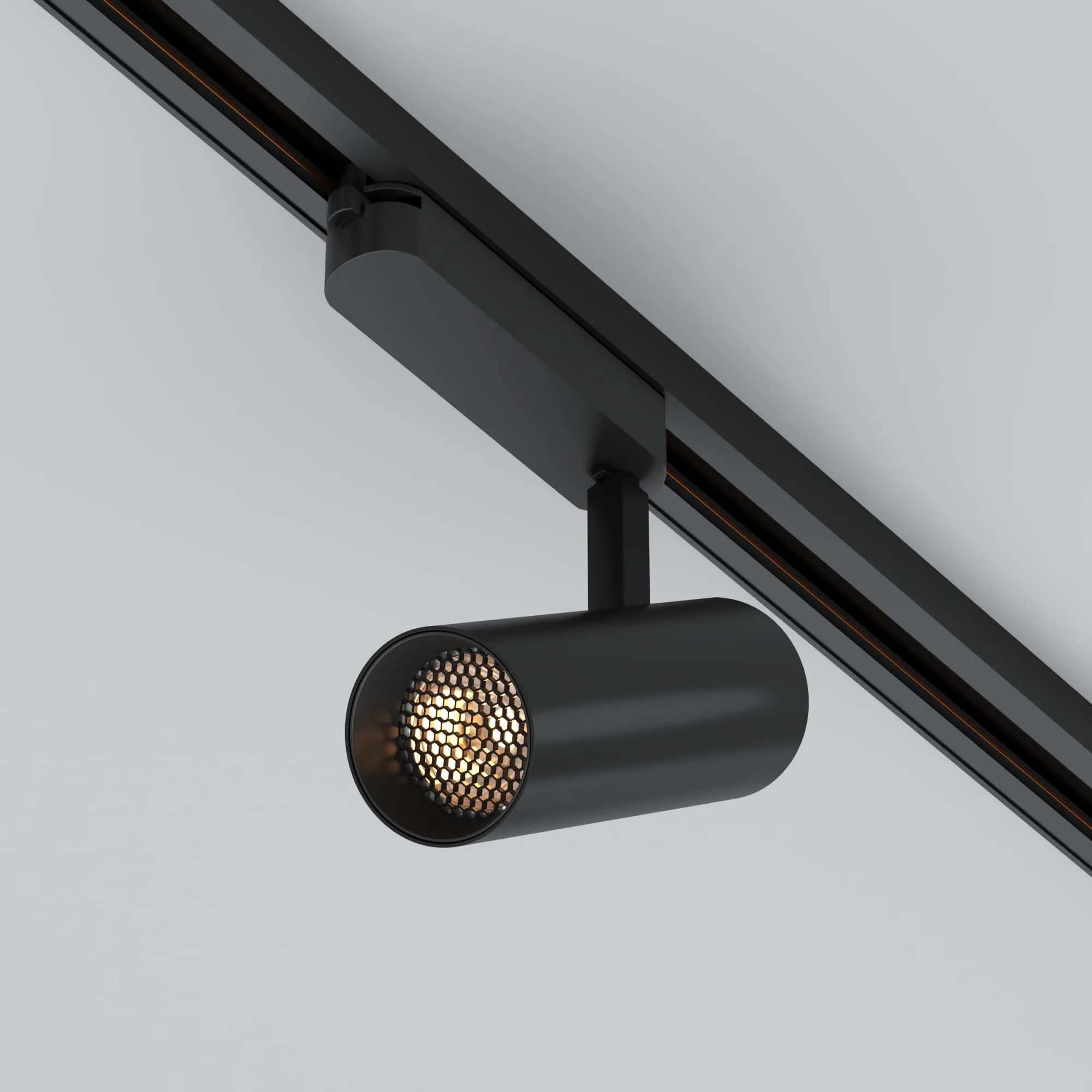Светильник для треков/шин 2 провода. Мощность 10 Вт, св. поток без решетки honeycomb 1000 лм, 100 лм/Вт, с решеткой honeycomb 660 лм, 66 лм/Вт, теплый 3000 K, CRI>90, угол 15°, напряжение питания 230 В. Черный круглый корпус из алюминия, материал линзы PMMA, степень защиты IP20. Размер: диаметр 55 мм, длина световой части 141 мм. Монтаж на трек 1-фазный. Драйвер встроенный 25-40 В, 250мА., пульсация <5%.
