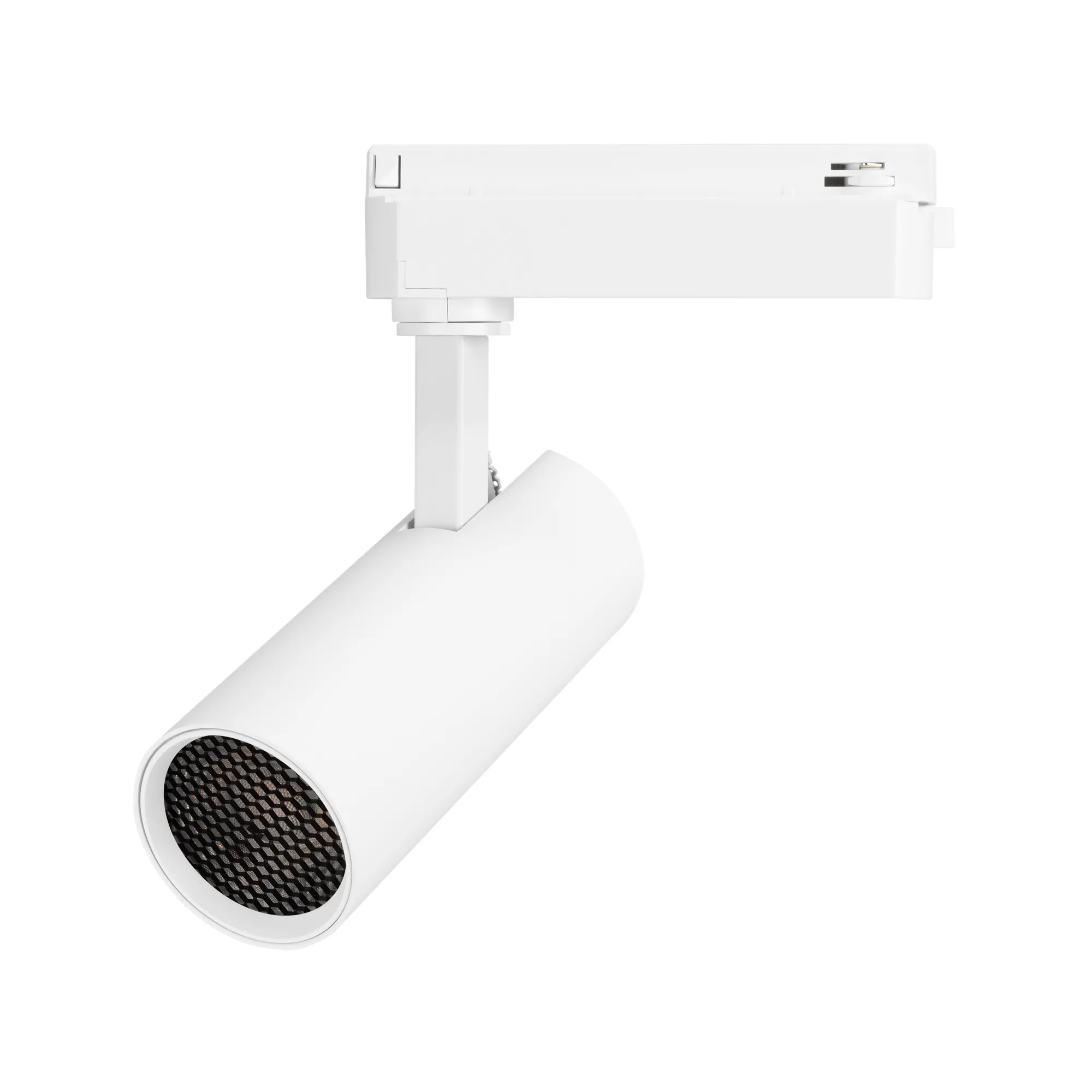 Светильник для треков/шин 2 провода. Мощность 15 Вт, св. поток без решетки honeycomb 1500 лм, 100 лм/Вт, с решеткой honeycomb 990 лм, 66 лм/Вт, дневной 4000 K, CRI>90, угол 55°, напряжение питания 230 В. Белый круглый корпус из алюминия, материал линзы PMMA, степень защиты IP20. Размер: диаметр 60 мм, длина световой части 141 мм. Монтаж на трек 1-фазный. Драйвер встроенный 350 мА 25-40 В, пульсация <5%.
