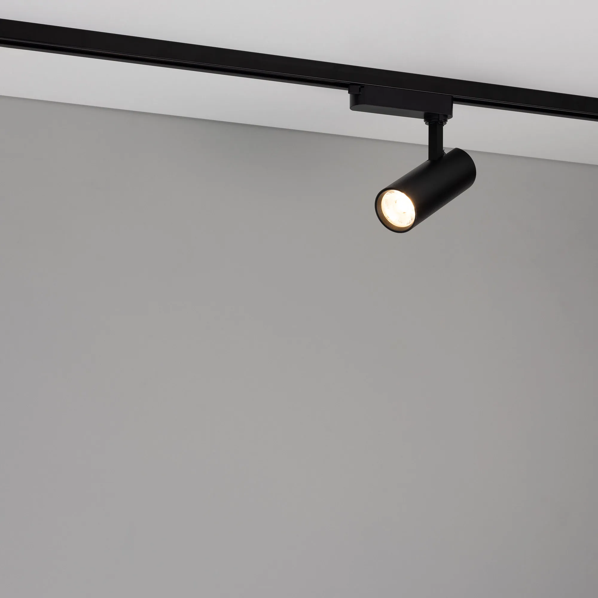 Светильник для треков/шин 2 провода. Мощность 10 Вт, св. поток без решетки honeycomb 1000 лм, 100 лм/Вт, с решеткой honeycomb 660 лм, 66 лм/Вт, дневной 4000 K, CRI>90, угол 55°, напряжение питания 230 В. Черный круглый корпус из алюминия, материал линзы PMMA, степень защиты IP20. Размер: диаметр 55 мм, длина световой части 141 мм. Монтаж на трек 1-фазный. Драйвер встроенный 25-40 В, 250мА., пульсация <5%.