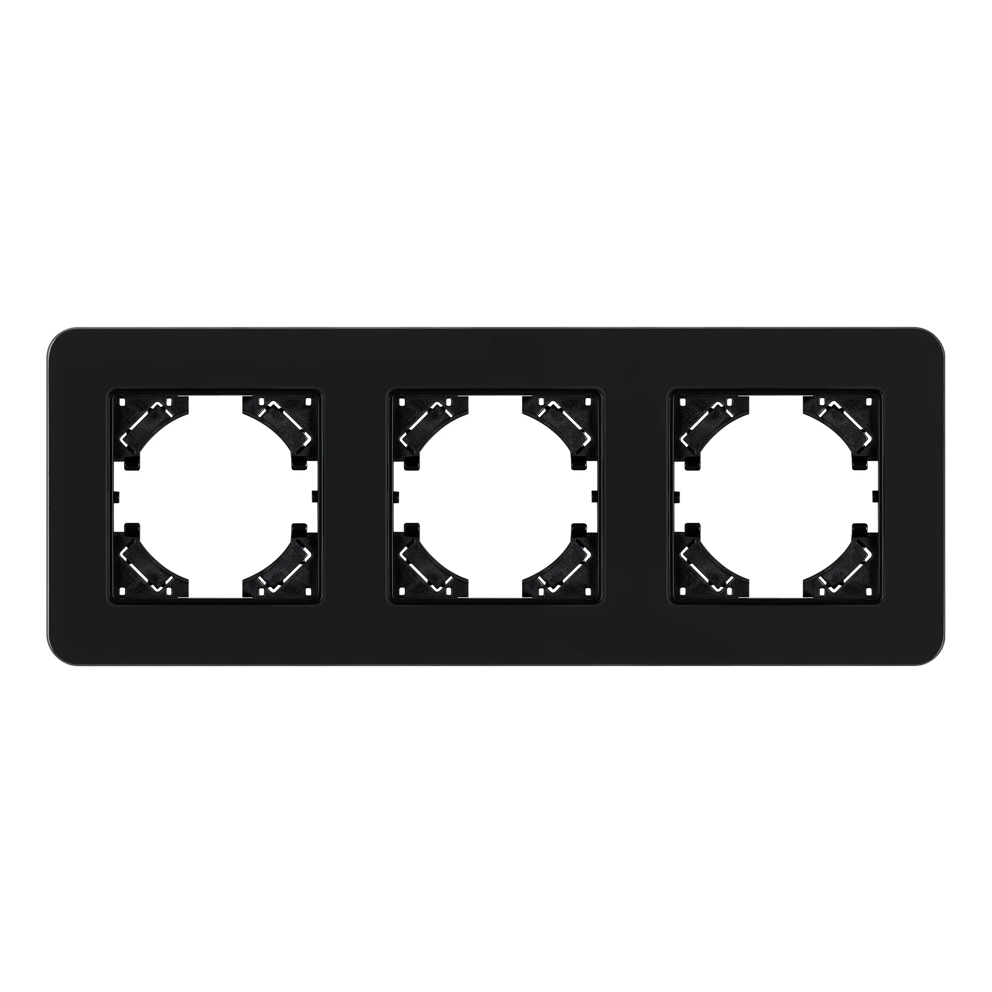 Рамка стеклянная на 3 поста, под встраиваемый механизм. Цвет - черный с Soft-Touch покрытием. Среднего уровня герметичности IP20. Ориентация монтажа - горизонтальная (основным ориентиром служат посадочные выступы для накладки механизма).