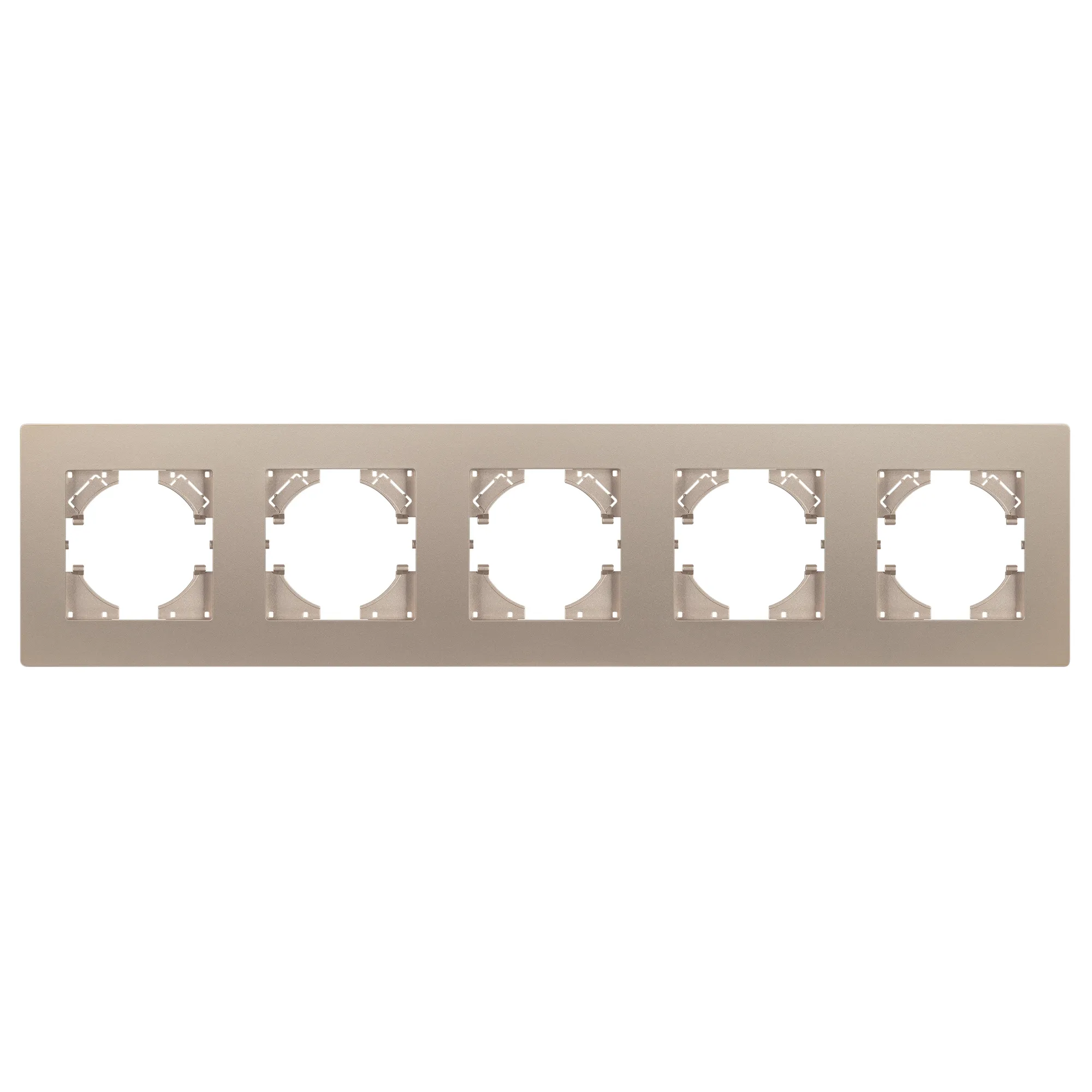 Рамка пластиковая на 5 постов, под встраиваемый механизм. Цвет - золотой. Среднего уровня герметичности IP20. Ориентация монтажа - горизонтальная (основным ориентиром служат посадочные выступы для накладки механизма).