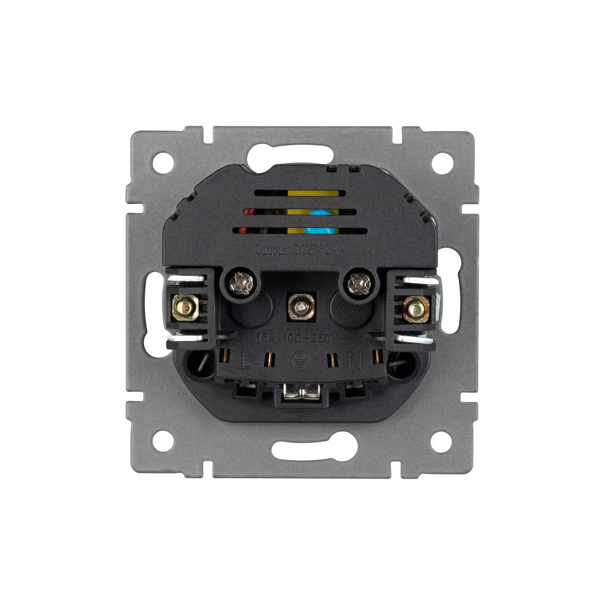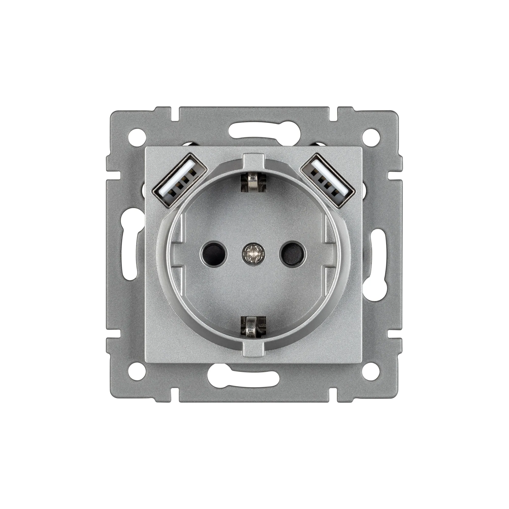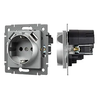 Механизм розетки с заземлением на 1 пост и 2USB Type A порта. Цвет - серый. Без фронтальной рамки. Уровень пылевлагозащиты IP20. Устанавливается в стандартный подрозетник.