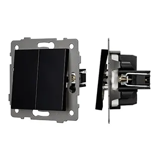 Механизм выключателя света клавишный на 1 пост 2 клавиши (проходной). Цвет - черный. Без фронтальной рамки. Уровень пылевлагозащиты IP20. Выключатель устанавливается в стандартный круглый подрозетник.