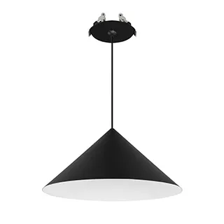 Подвесной светильник. Мощность 10 Вт, св. поток 650 лм, 65 лм/Вт, теплый 2700 K, CRI>94, угол 36°, напряжение питания 230 В. Черный корпус из алюминия в форме конуса с белой внутренней поверхностью, линза-рассеиватель из PMMA, степень защиты IP20. Размер: диаметр 240 мм, высота 110 мм. Монтаж подвесной, длина подвеса 2000 мм, регулируемая. В комплекте две чаши. Габариты чаши (встроенной) Ø80 х 41 мм, врезное отверстие Ø55 мм, габариты чаши (накладной) Ø110 х 25 мм. Драйвер 2,8-12В, 520 мА, пульсация <1%.Управление по TRIAC.