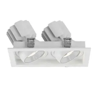 Встраиваемый карданный светильник. Мощность 2х30 Вт, св. поток 5300 лм, 88 лм/Вт, тёплый 3000 K, CRI>92, угол 50°, напряжение питания 230 В. Белый корпус из алюминия, степень защиты IP20. Размер: длина 250 мм, ширина 140 мм, высота 125 мм. Монтаж встраиваемый, установочное отверстие: длина 230 мм, ширина 120 мм. Драйвер 24-42 В, 750 мА, пульсация <2%.
