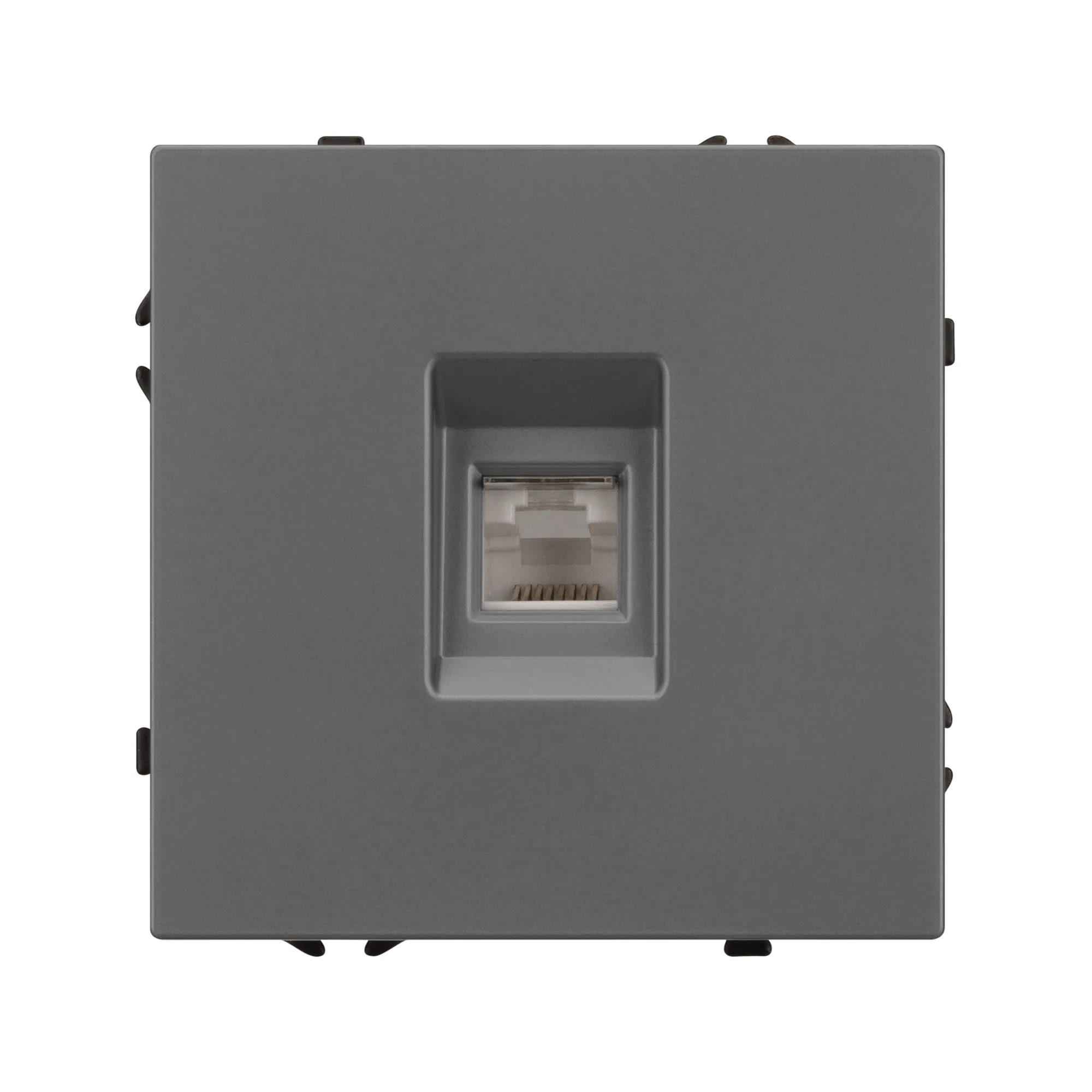 Механизм компьютерной розетки на 1 пост 6-й категории. Цвет - серый, с Soft-Touch покрытием. Без фронтальной рамки. Уровень пылевлагозащиты IP20. Тип подключаемого разъема - RJ45. Розетка устанавливается в стандартный подрозетник круглого сечения диаметром 60мм.