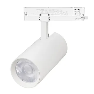 Светильник для треков/шин 4 провода с управлением TRIAC. Мощность 30 Вт, св. поток без решетки honeycomb 3000 лм, 100 лм/Вт, с решеткой honeycomb 1980 лм, 66 лм/Вт, дневной 4000 K, CRI>90, угол 55°, напряжение питания 230 В. Белый круглый корпус из алюминия, материал линзы PMMA, степень защиты IP20. Размер: диаметр 90 мм, длина световой части 141 мм. Монтаж на трек 3-фазный. Драйвер встроенный 24-42 В, 750мА., пульсация <5%
