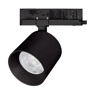 Светильник для трехфазных треков, 36 Вт с управлением TRIAC. Цвет свечения ДНЕВНОЙ 4000K, световой поток 3420 лм, угол 20°, CRI>90. Корпус круглый, металл, цвет черный, IP20. Размеры Ø100x93 мм. Входное напряжение AC220-240V. Драйвер встроенный 9-40В (300 - 1050мА), 50/60Гц, максимальная мощность 42 Вт.