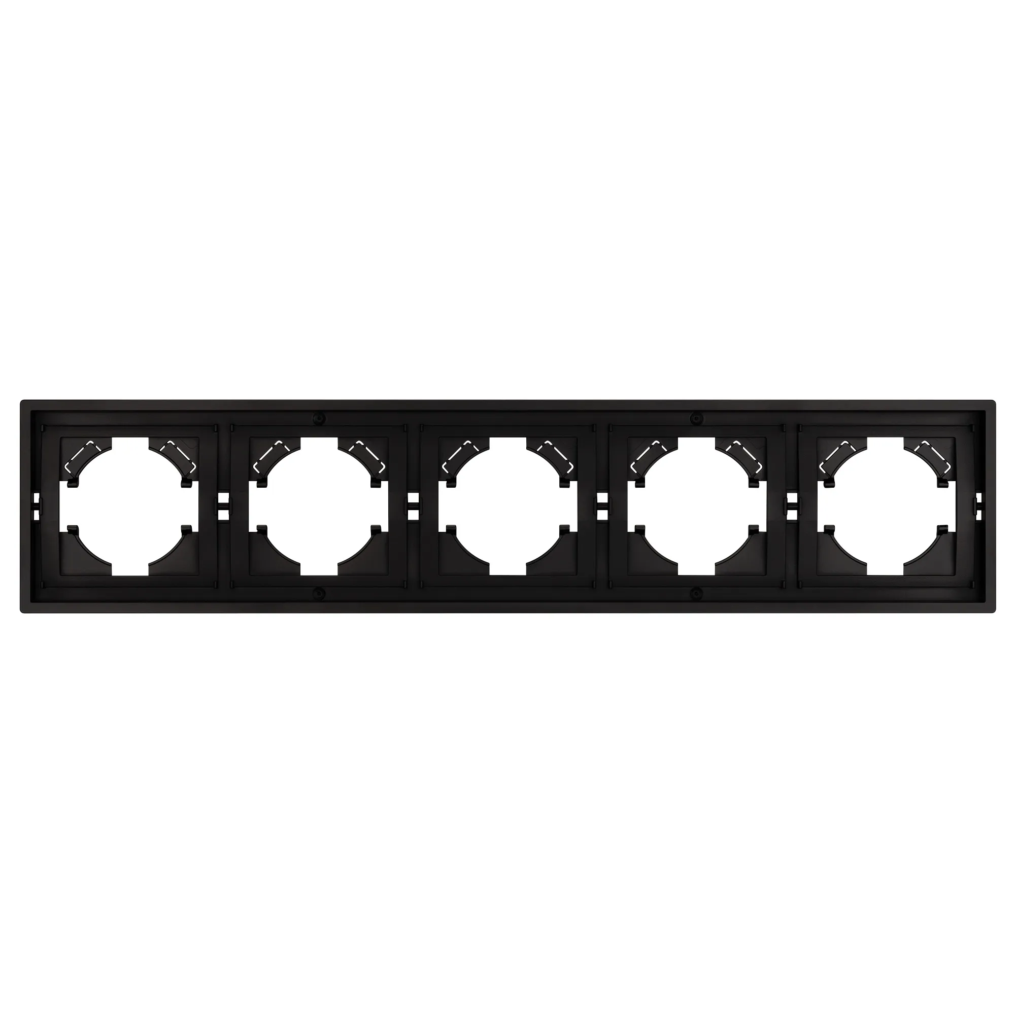 Рамка пластиковая на 5 постов, под встраиваемый механизм. Цвет - черный. Среднего уровня герметичности IP20. Ориентация монтажа горизонтальная.