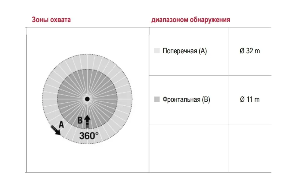 | диапазоном обнаружения Фронтально | Ø 11 м |