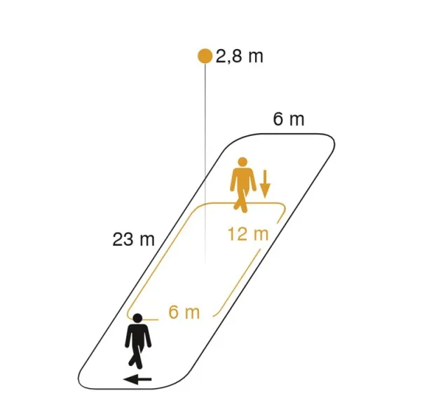 Проходы и длинные коридоры предъявляют особые требования к характеристикам датчиков. Зона обнаружения датчика должна быть узкой, но длинной. Только так минимальное количество датчиков может покрыть участки максимально возможной длины. Испытанный и проверенный снова и снова, IS 345 является специалистом для внутреннего применения этого типа. Он специально разработан для обнаружения в коридорах и имеет угол раскрытия 45 °. Это означает, что он может наблюдать за площадью до 23 х 6 метров по касательной.