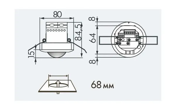 - Дистанционно управляемый потолочный датчик присутствия PD2-M-2C в исполнении ведущего (Master) устройства для скрытого монтажа в подвесной потолок с круговым диапазоном обнаружения.